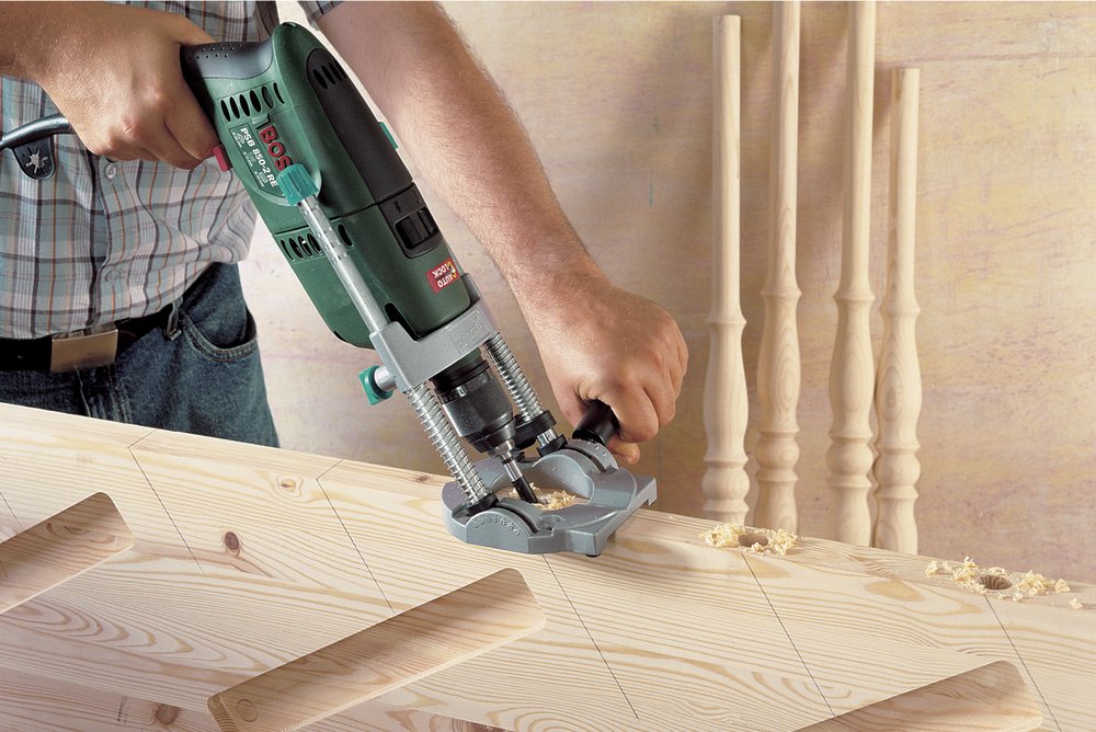 mobilní stojan na vrtačky, otočné, dvousloupkové vedení se stupnicí (vodorovné, kolmé, šikmé +/- 45?), hloubkový doraz, posuv pro sériové vrtání v jedné řadě, přídavné držátko, upevnění na základnu – funkce klasického vrtačkového stojanu, zásobník na vrtáky v držadle, nástavec pro odsávání prachu, V drážka pro fixaci kruhových předmětů, průměr upínání vrtačky 43 mm (euronorma)