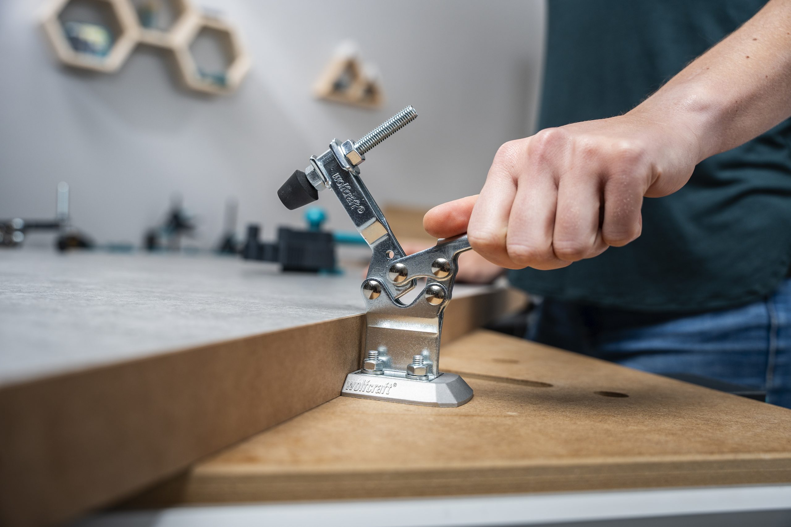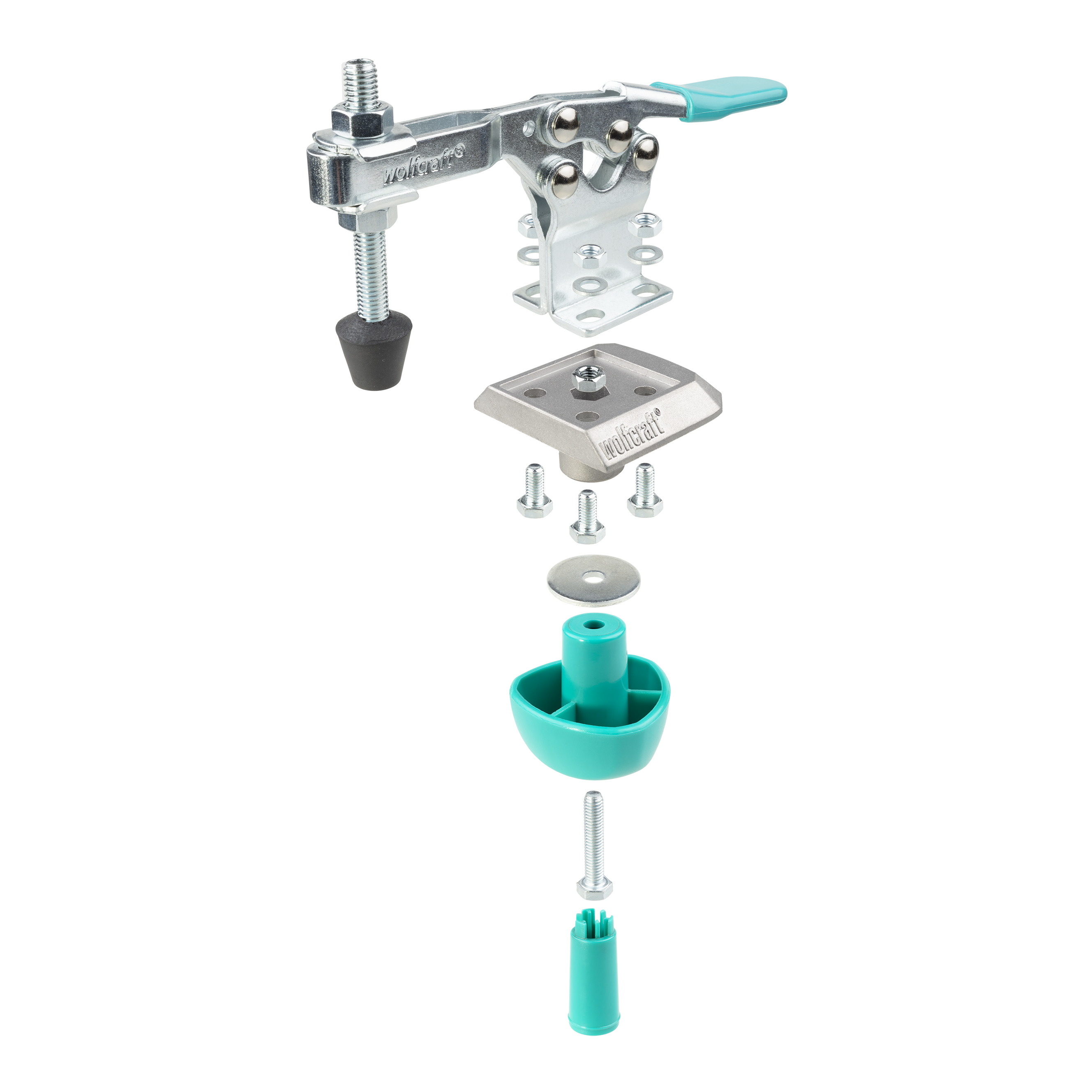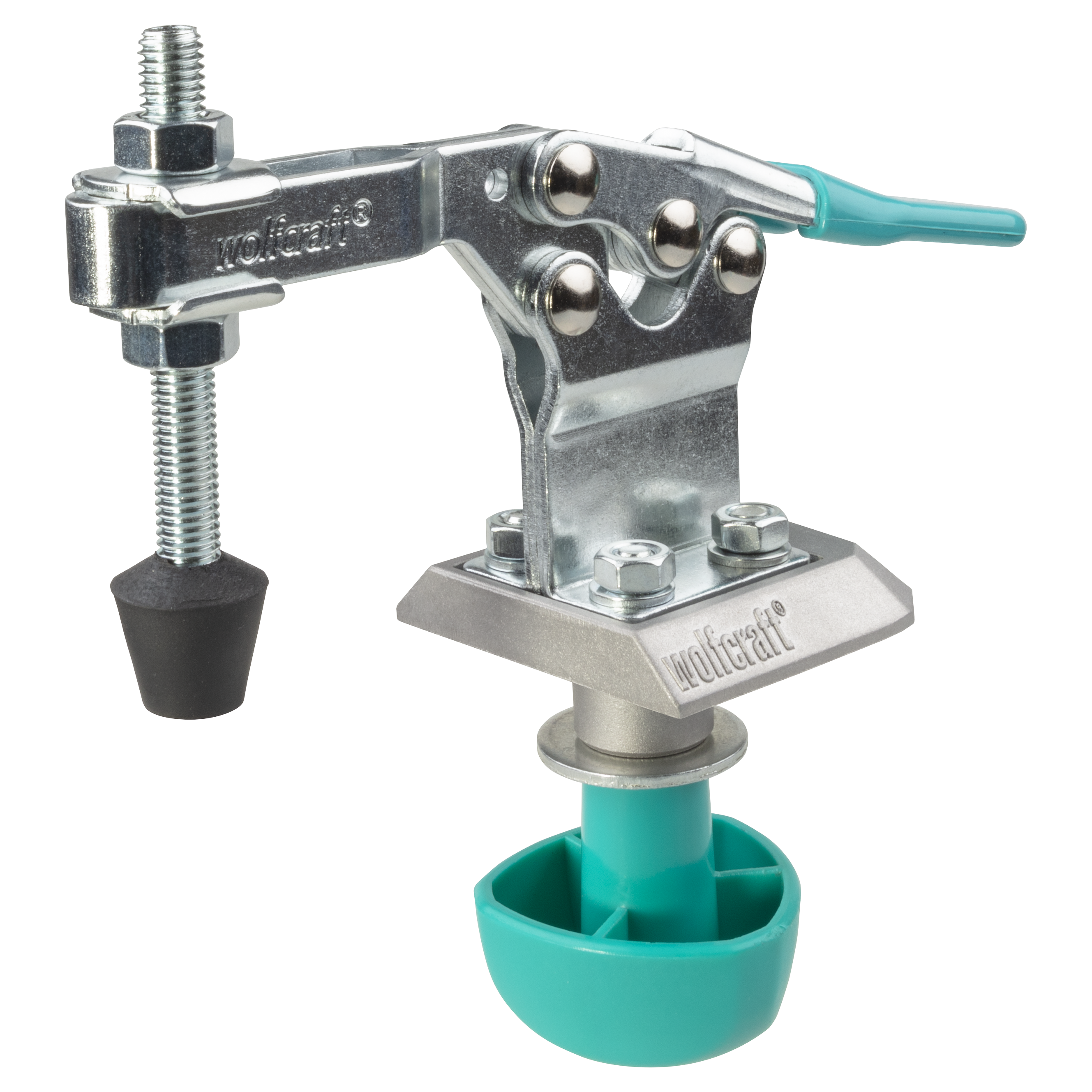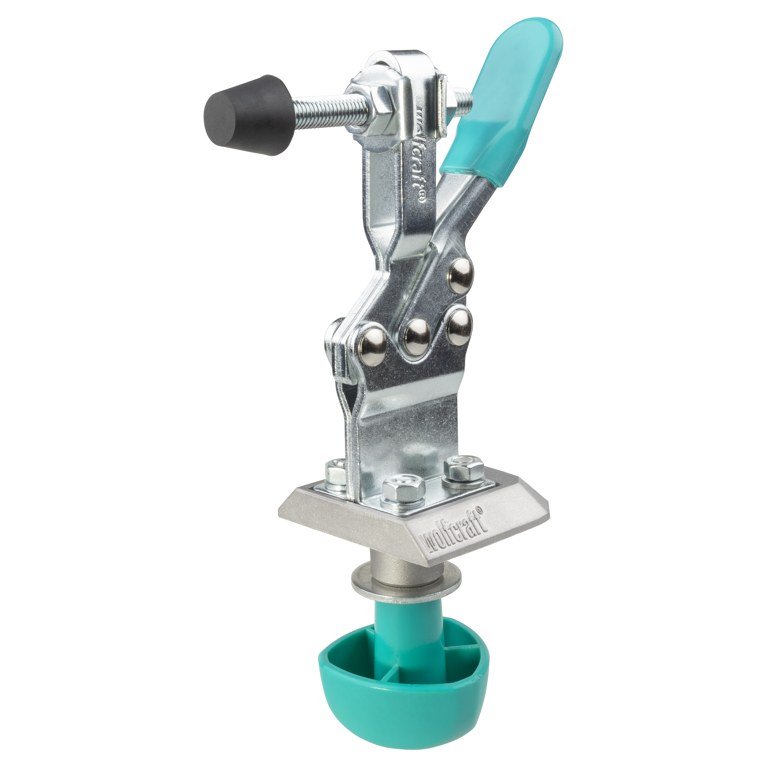 | mobilní ocelový rychloupínač k upevnění na pracovní desky pro bezpečné a rychlé fixování obrobků odnímatelná adaptérová deska z tlakově litého hliníku pro uchycení do 20mm děr upínací síla až 150 kg pro všestranné použití při realizaci projektů zásuvný šroub s ergonomickou rukojetí pro bezpečné a pohodlné přišroubování pod pracovní deskou bez adaptérové desky lze rychloupínač přišroubovat přímo k pracovní desce (upevňovací šrouby nejsou součástí dodávky) závitové vřeteno pro flexibilní nastavení šířky upnutí od 0 do 38 mm upínací páka s gumovým povlakem neobsahujícím PVC pro pohodlné používání bez rizika sklouznutí přítlačný trn je vyroben z vysoce kvalitního kaučuku NBR pro upnutí šetrné k povrchu a protiskluzové zafixování obrobku dlouhé, pohyblivé upínací rameno s rozsahem vyložení 25–65 mm k flexibilnímu použití při různém upínání |