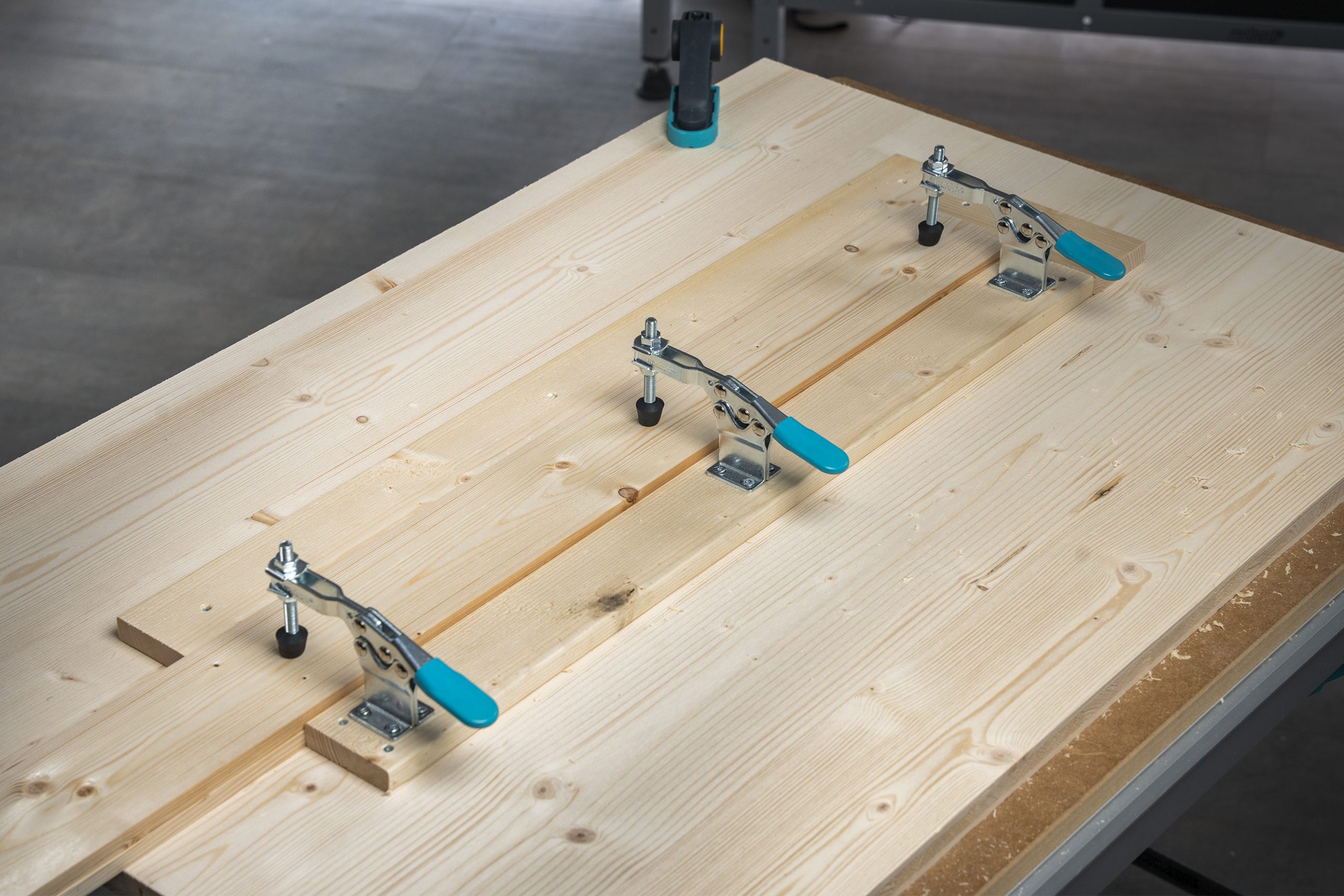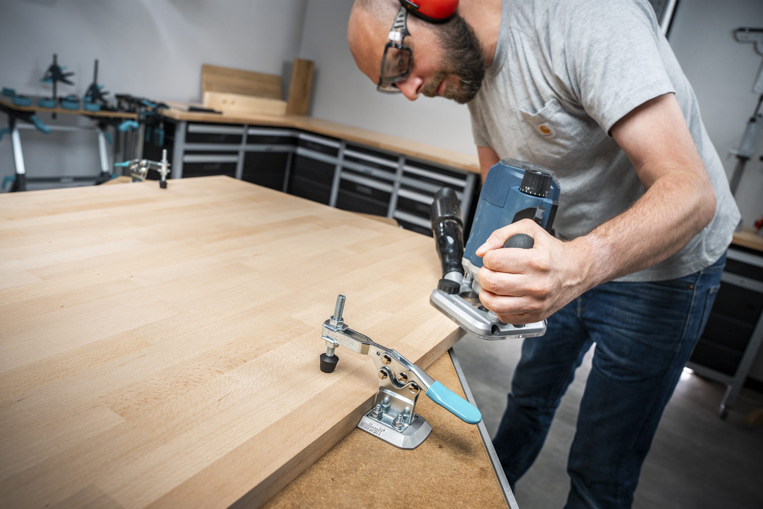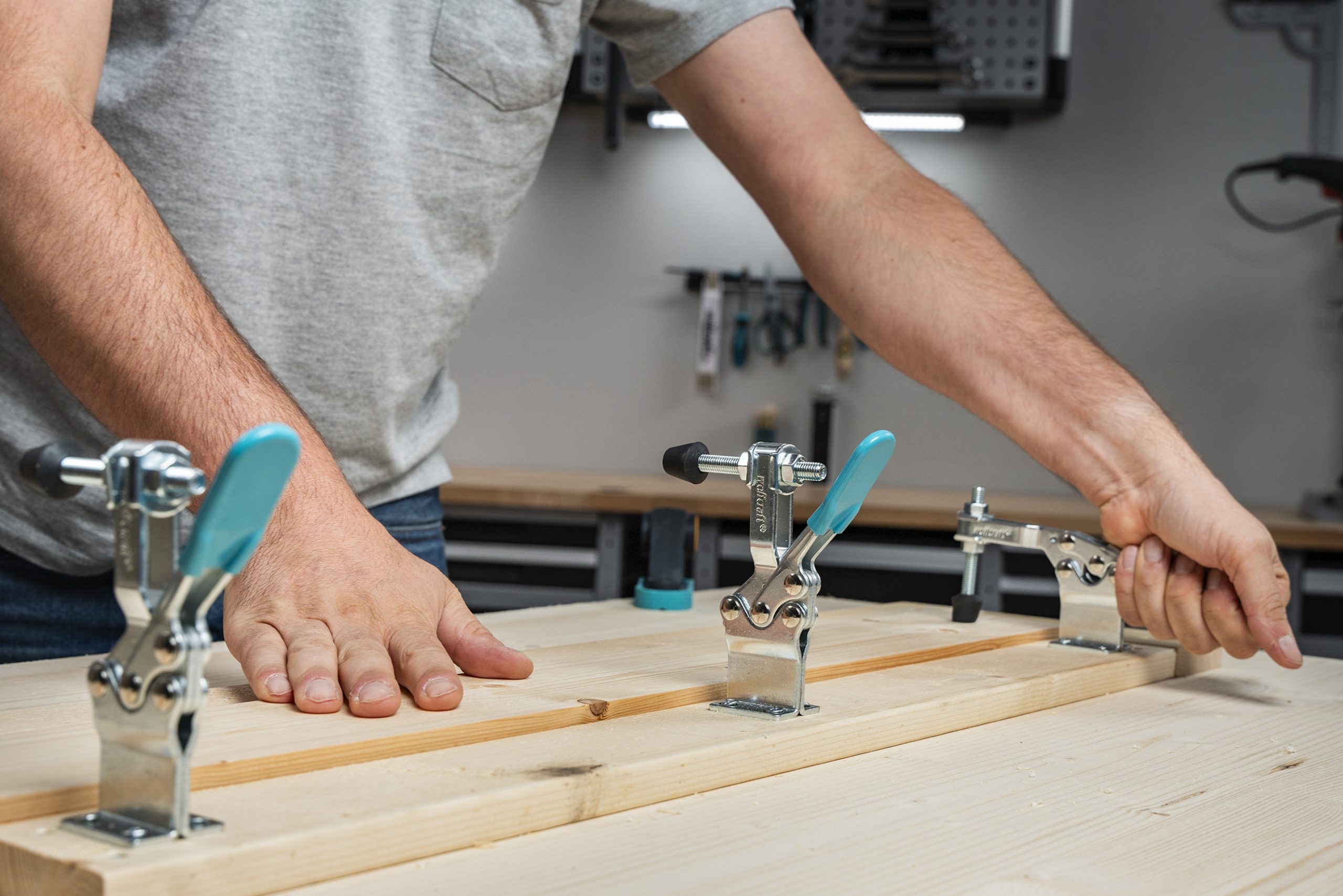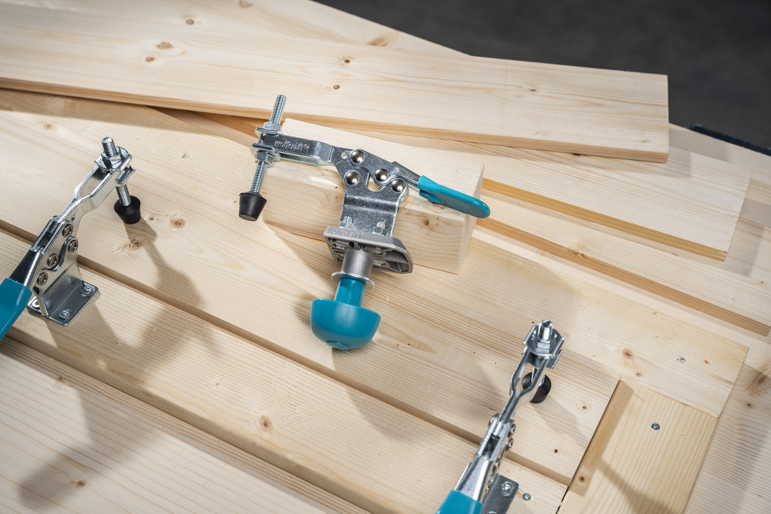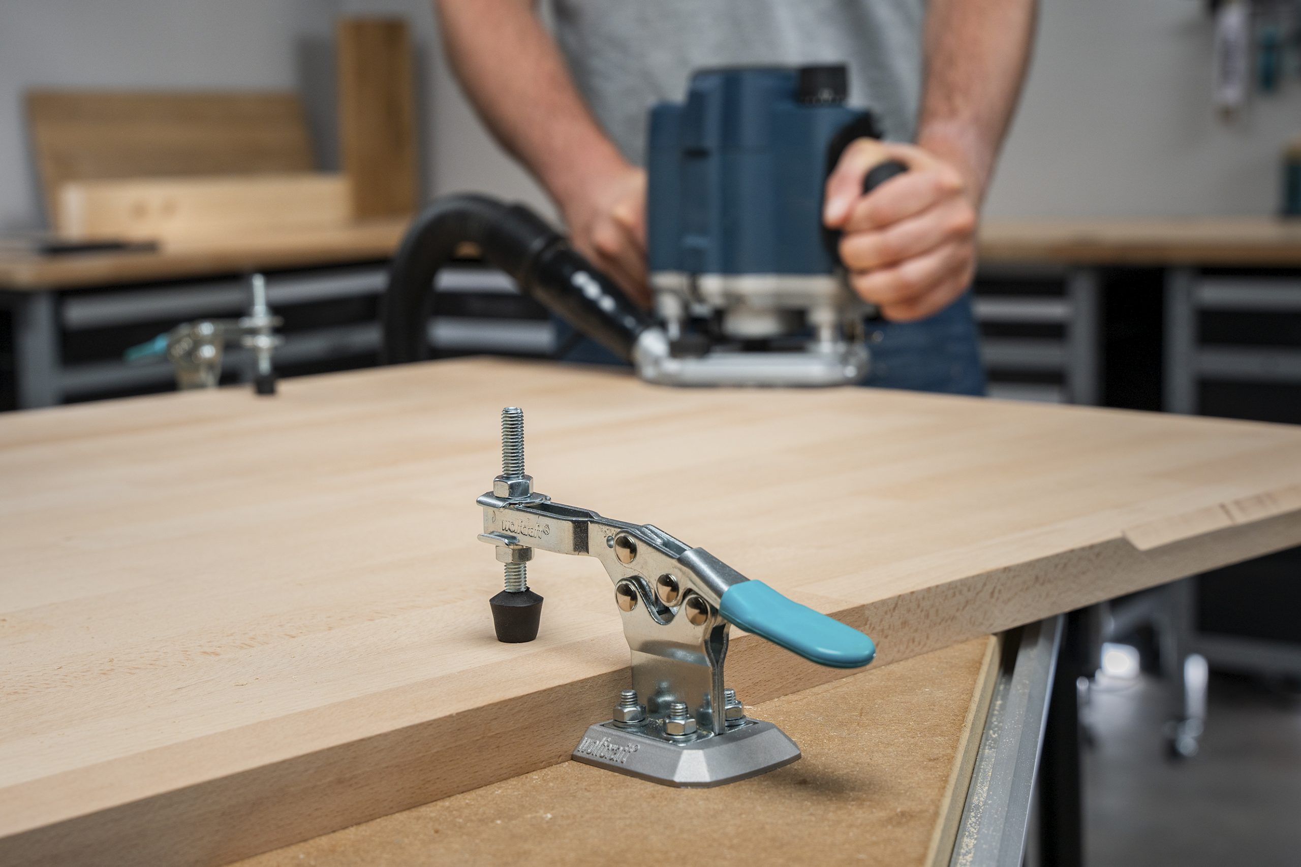 | mobilní ocelový rychloupínač k upevnění na pracovní desky pro bezpečné a rychlé fixování obrobků odnímatelná adaptérová deska z tlakově litého hliníku pro uchycení do 20mm děr upínací síla až 150 kg pro všestranné použití při realizaci projektů zásuvný šroub s ergonomickou rukojetí pro bezpečné a pohodlné přišroubování pod pracovní deskou bez adaptérové desky lze rychloupínač přišroubovat přímo k pracovní desce (upevňovací šrouby nejsou součástí dodávky) závitové vřeteno pro flexibilní nastavení šířky upnutí od 0 do 38 mm upínací páka s gumovým povlakem neobsahujícím PVC pro pohodlné používání bez rizika sklouznutí přítlačný trn je vyroben z vysoce kvalitního kaučuku NBR pro upnutí šetrné k povrchu a protiskluzové zafixování obrobku dlouhé, pohyblivé upínací rameno s rozsahem vyložení 25–65 mm k flexibilnímu použití při různém upínání |