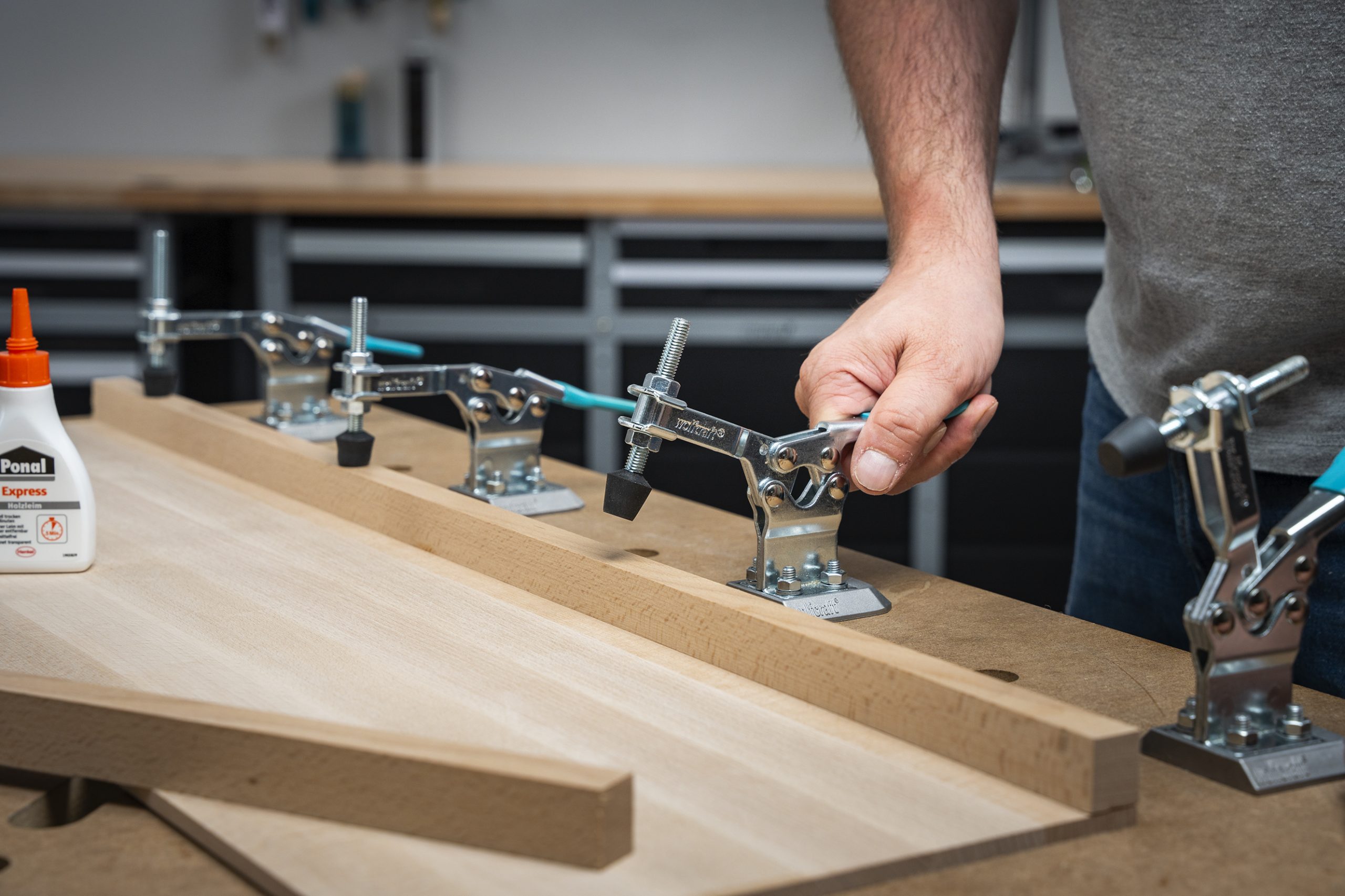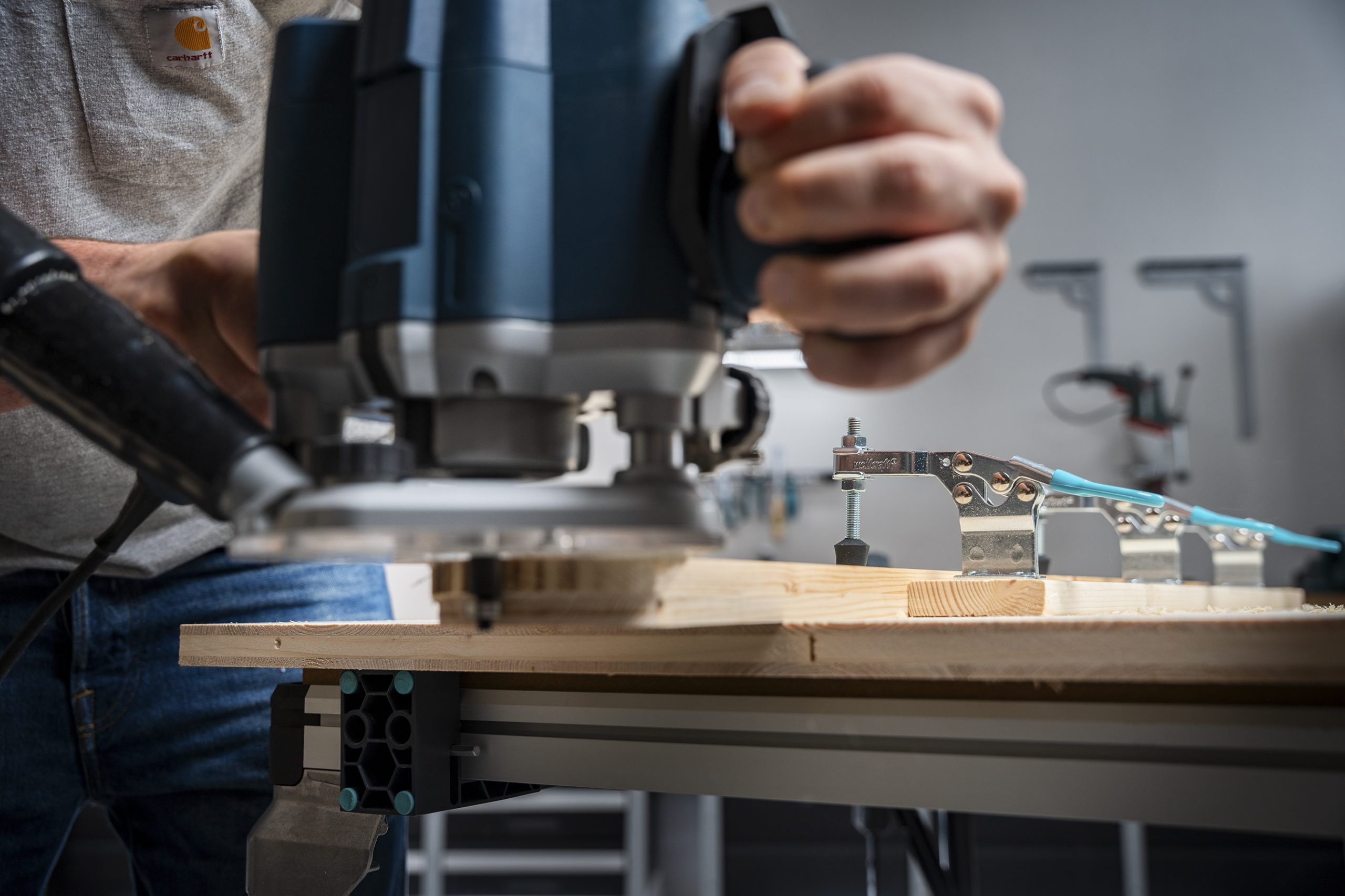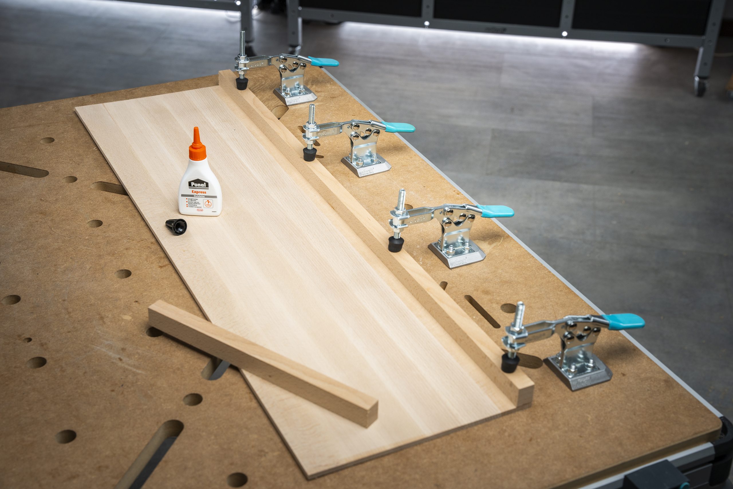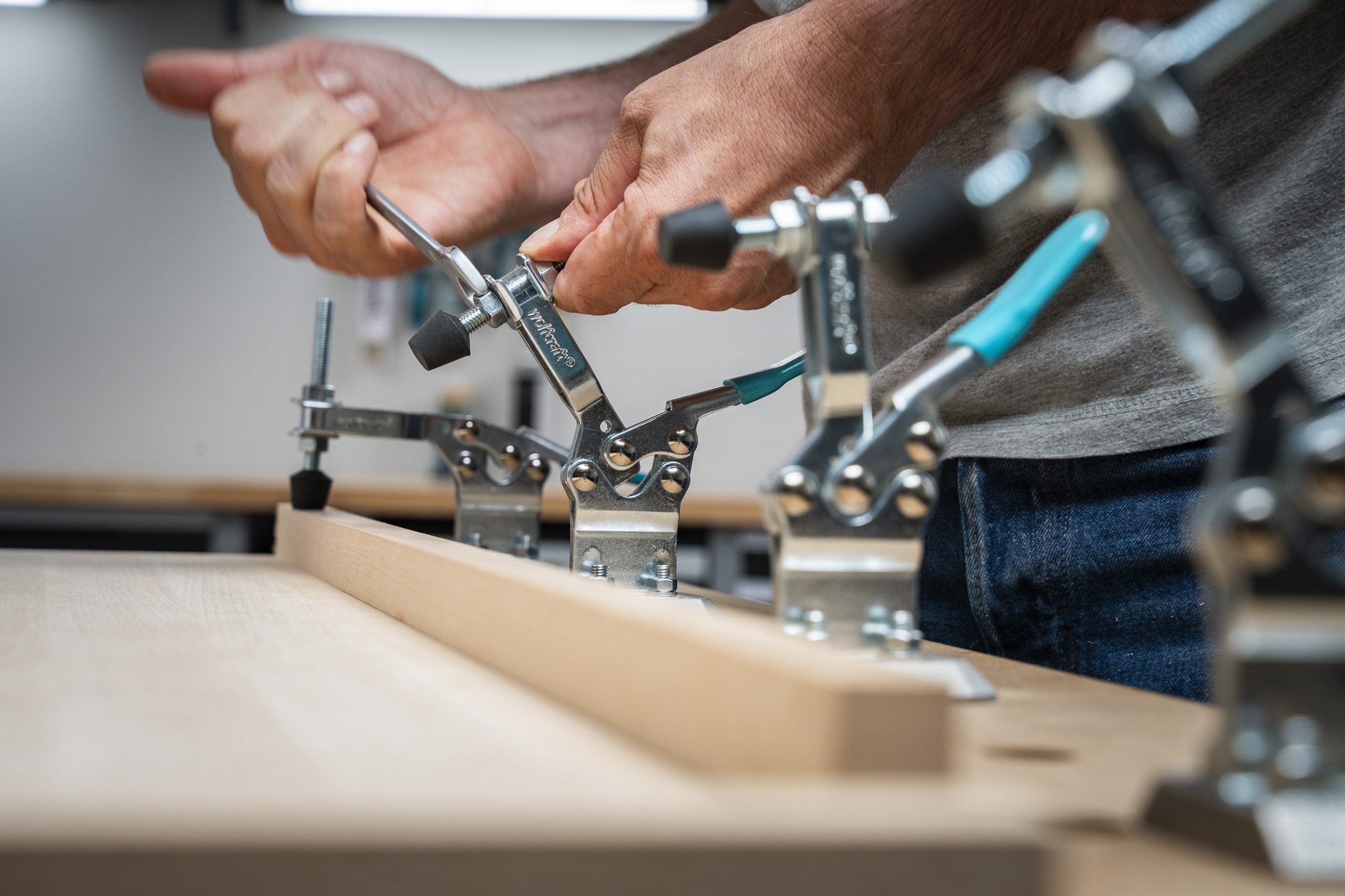 | mobilní ocelový rychloupínač k upevnění na pracovní desky pro bezpečné a rychlé fixování obrobků odnímatelná adaptérová deska z tlakově litého hliníku pro uchycení do 20mm děr upínací síla až 150 kg pro všestranné použití při realizaci projektů zásuvný šroub s ergonomickou rukojetí pro bezpečné a pohodlné přišroubování pod pracovní deskou bez adaptérové desky lze rychloupínač přišroubovat přímo k pracovní desce (upevňovací šrouby nejsou součástí dodávky) závitové vřeteno pro flexibilní nastavení šířky upnutí od 0 do 38 mm upínací páka s gumovým povlakem neobsahujícím PVC pro pohodlné používání bez rizika sklouznutí přítlačný trn je vyroben z vysoce kvalitního kaučuku NBR pro upnutí šetrné k povrchu a protiskluzové zafixování obrobku dlouhé, pohyblivé upínací rameno s rozsahem vyložení 25–65 mm k flexibilnímu použití při různém upínání |