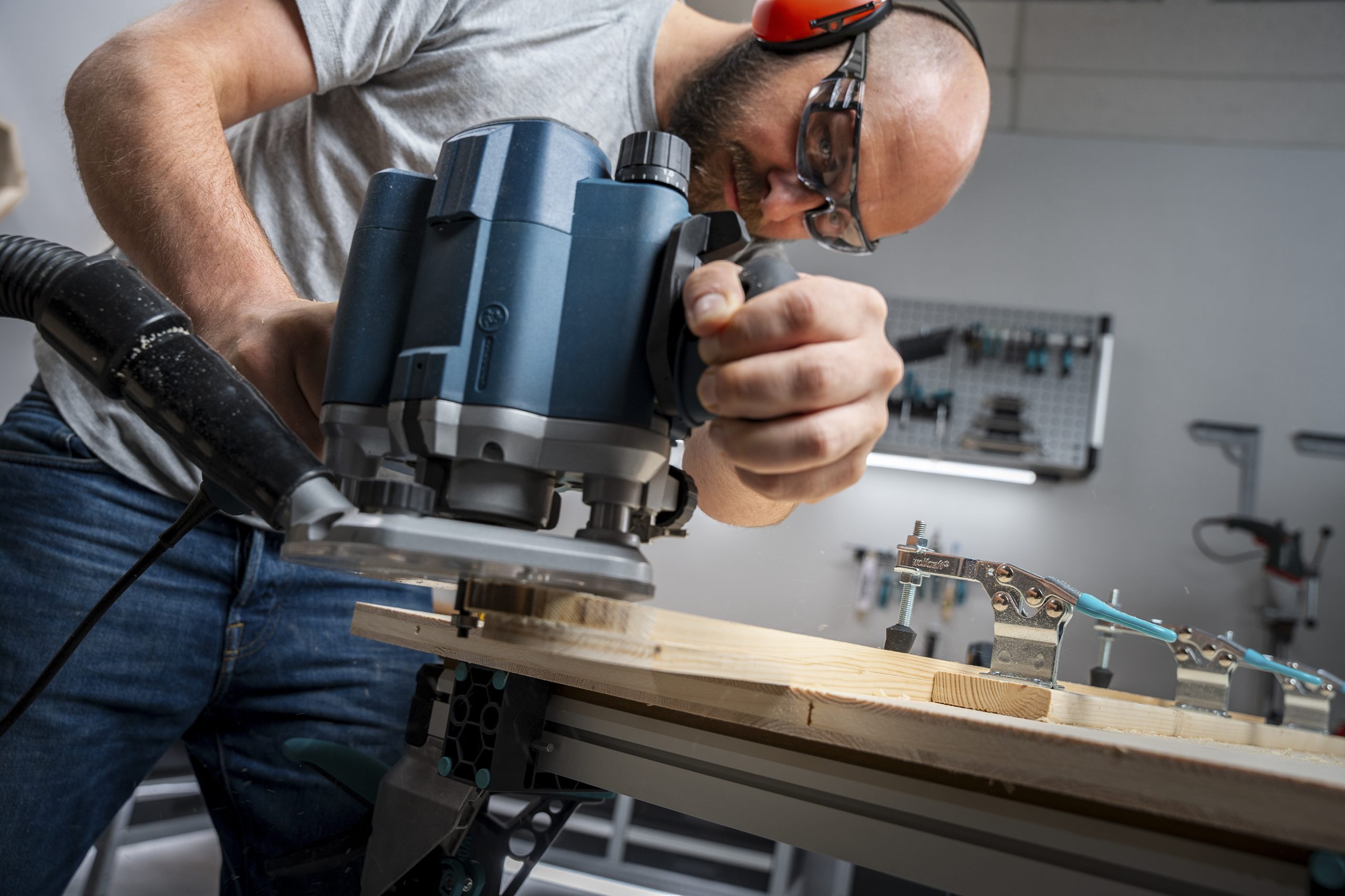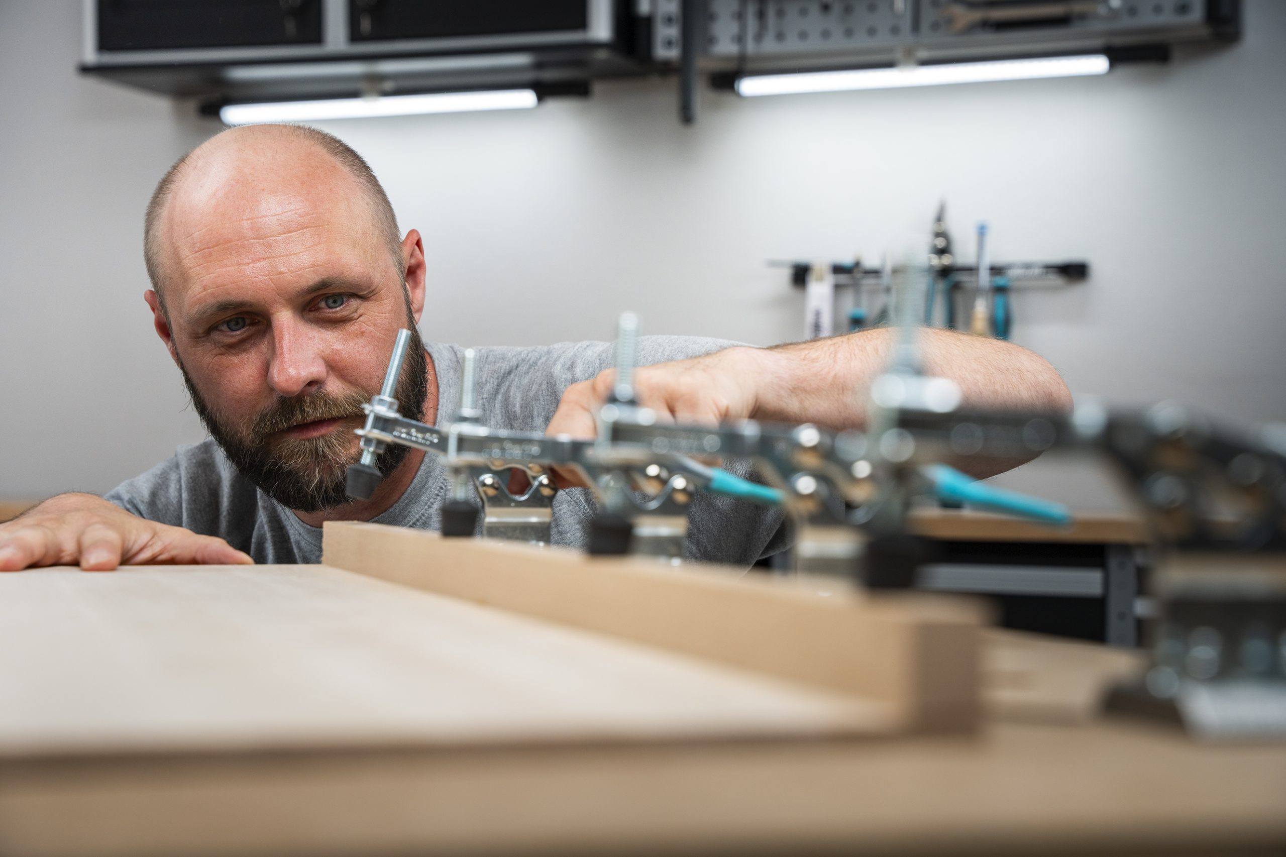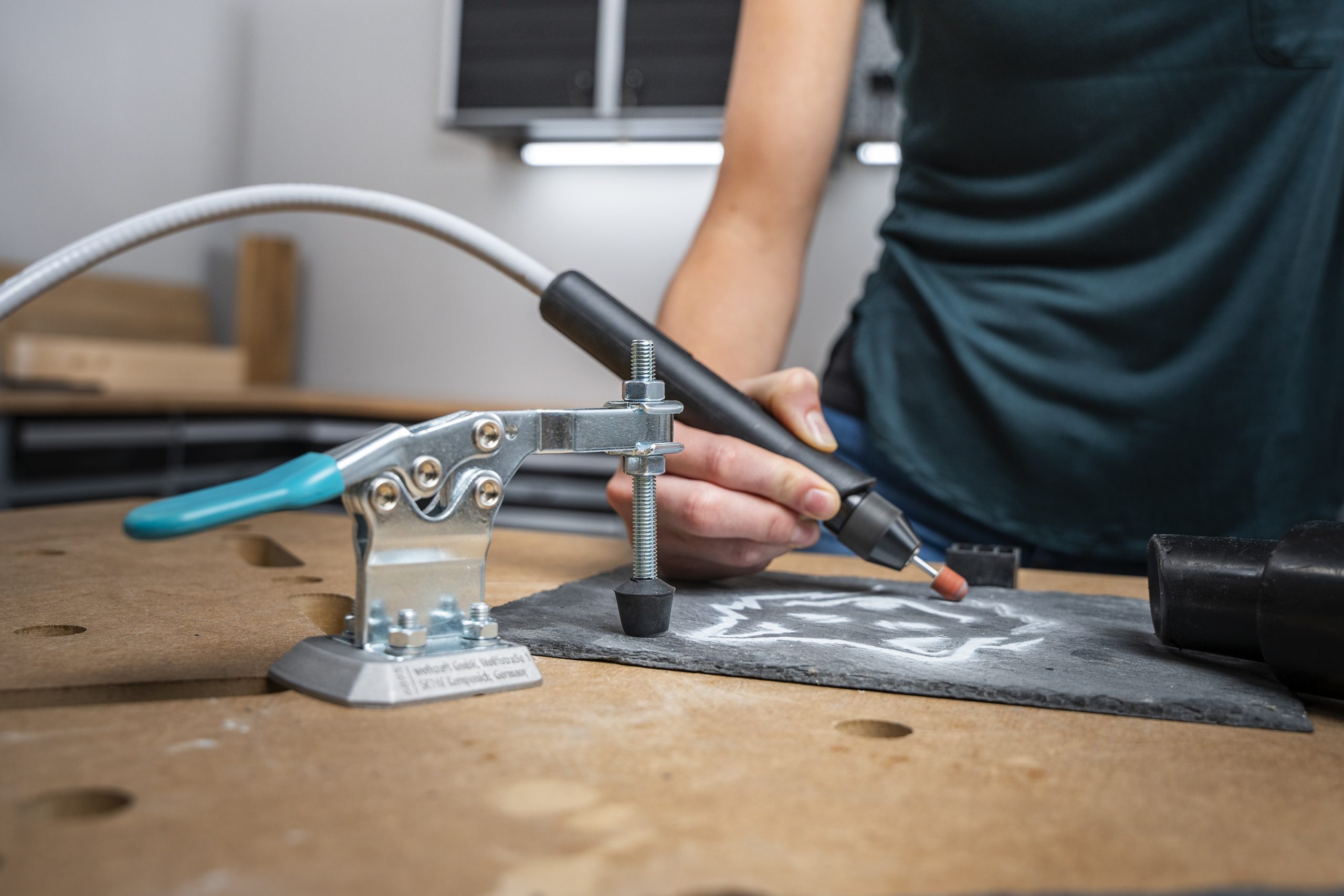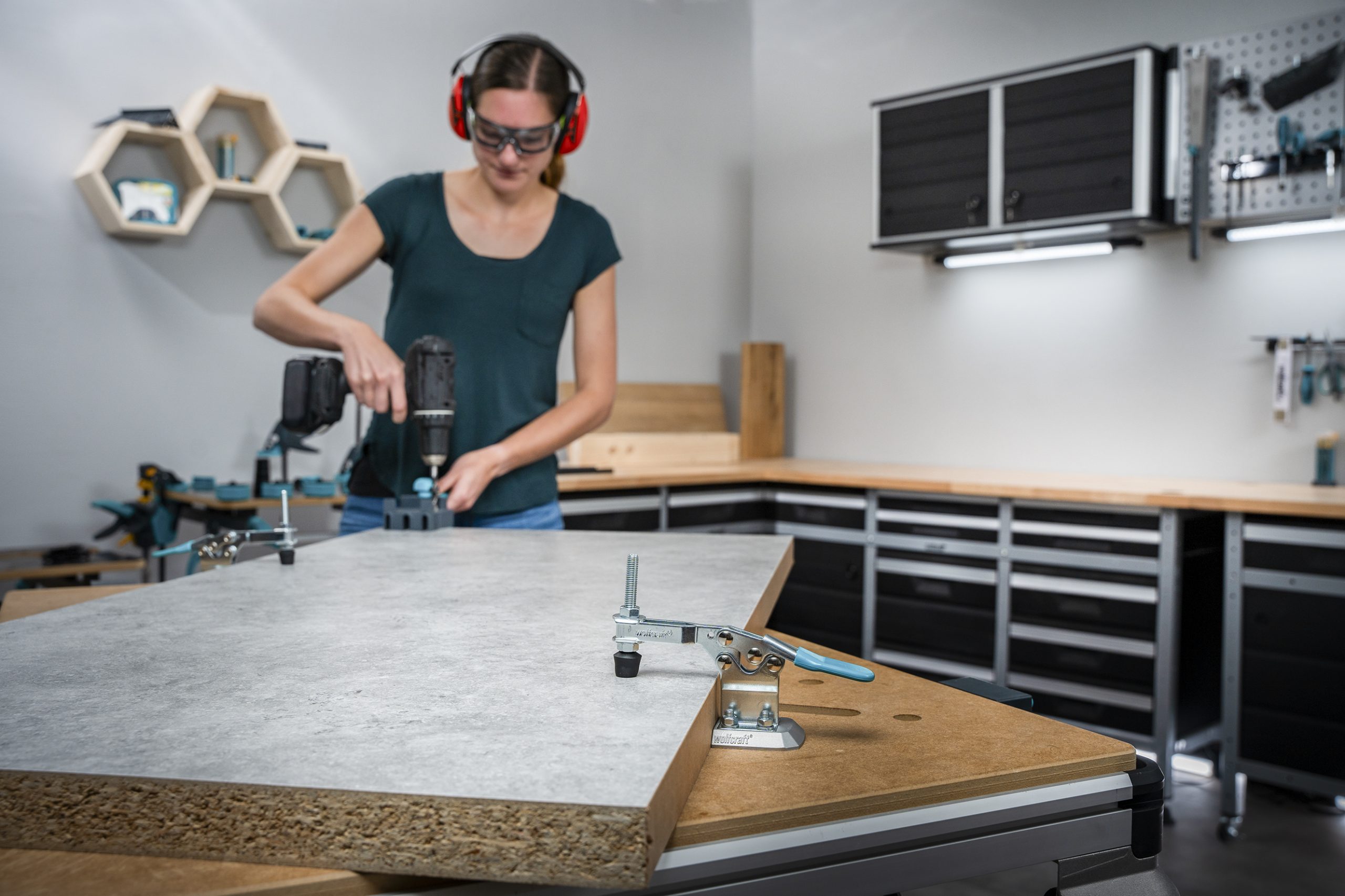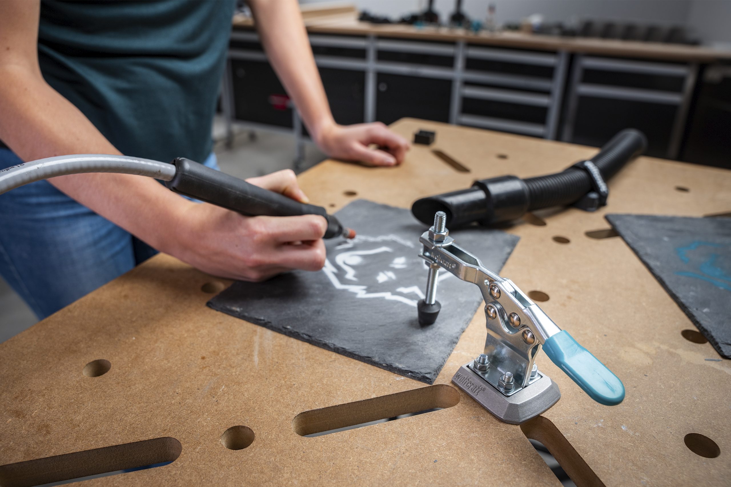 | Mobilní rychloupínač vyrobený z oceli je ideální pro všechny projekty, při nichž potřebujete bezpečně upínat a opracovávat obrobky. Pomocí adaptérové desky z tlakově litého hliníku se dá během několika málo sekund přichytit ke všem stolům s otvory 20 mm. Stačí zasunout a pevně utáhnout zásuvný šroub pod pracovní deskou. Díky ergonomické rukojeti to zvládnete rychle, bezpečně a pohodlně. Při upevnění tímto způsobem můžete s tímto nářadím vyvinout upínací sílu až 150 kg. Mobilní rychloupínač se ideálně hodí pro sériové práce. Alternativně můžete adaptérovou desku také odejmout a přišroubovat mobilní rychloupínač čtyřmi šrouby natrvalo přímo k pracovní desce. Pomocí závitového vřetena můžete flexibilně nastavovat šířku upnutí od 0 do 38 mm podle opracovávaných obrobků. S rozsahem vyložení 25 až 65 mm se ideálně hodí k flexibilnímu použití při různém upínání. Ovládá se upínací pákou, která je pro optimální uchopení potažena gumovým povlakem neobsahujícím PVC. Přítlačný trn je vyroben z vysoce kvalitního kaučuku NBR pro upnutí šetrné k povrchu a protiskluzové zafixování obrobku. |