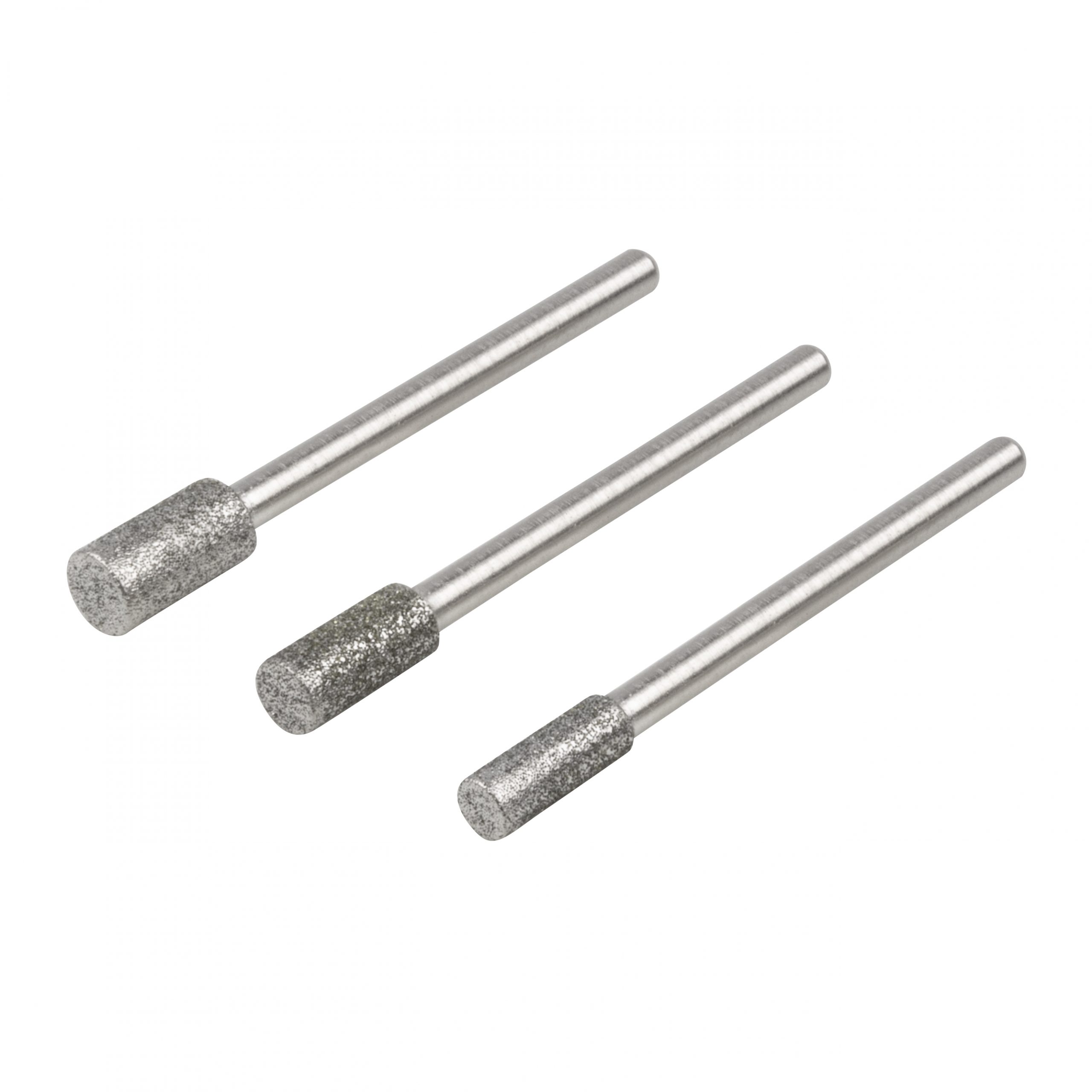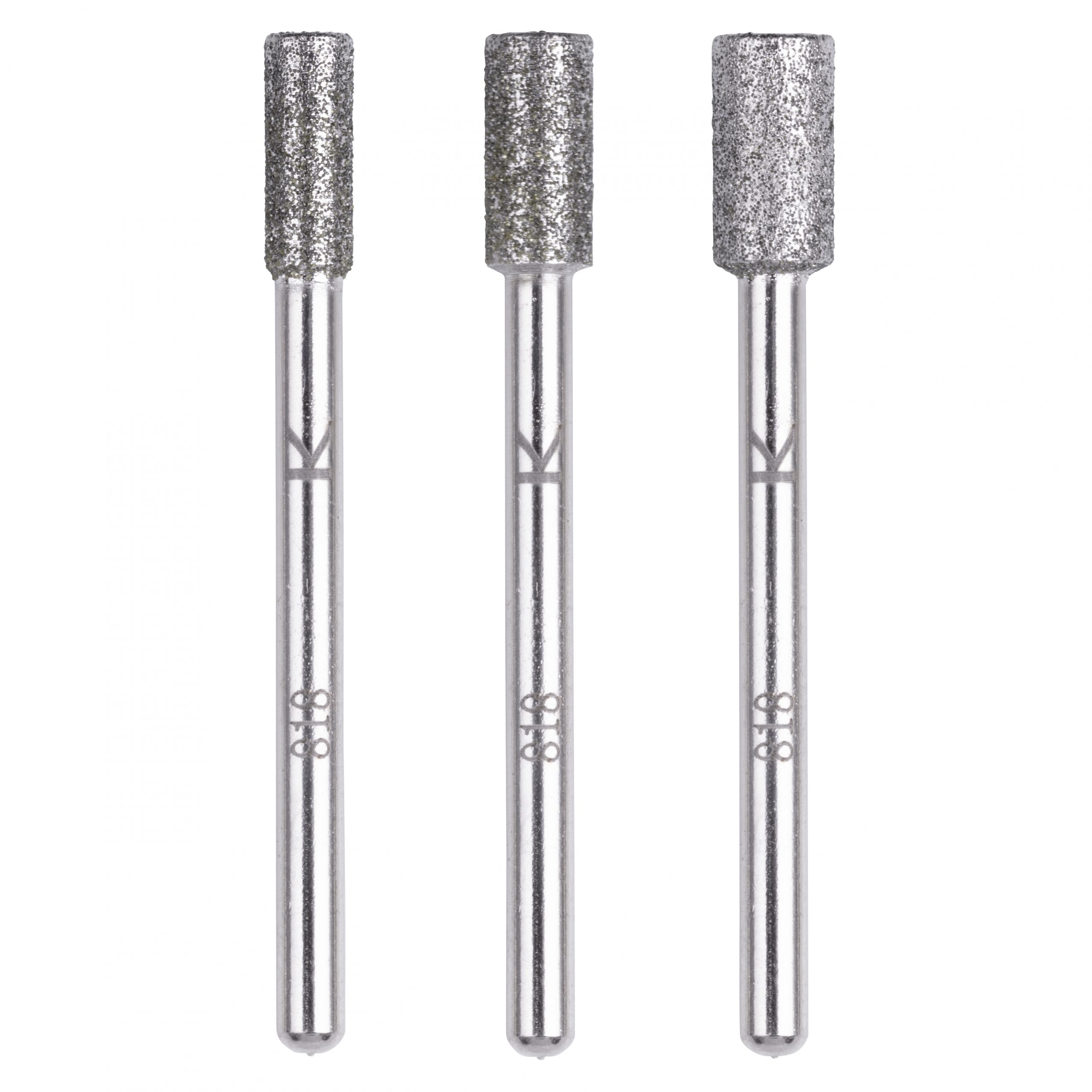 Mini brusky s diamantovou brusnou plochou. Určeno pro keramiku, sklo, železo, barevné kovy, plast. Vhodné pro detailní práci s keramickou dlažbou, gravírování, rozšiřování otvorů. Pracovní hloubka do 15 mm. Průměr hřídele 3 mm. Pracovní rozmezí otáček 8-15 000, jen pravý chod. Sada obsahuje 3 ks brusek s cylindrickou hlavou.