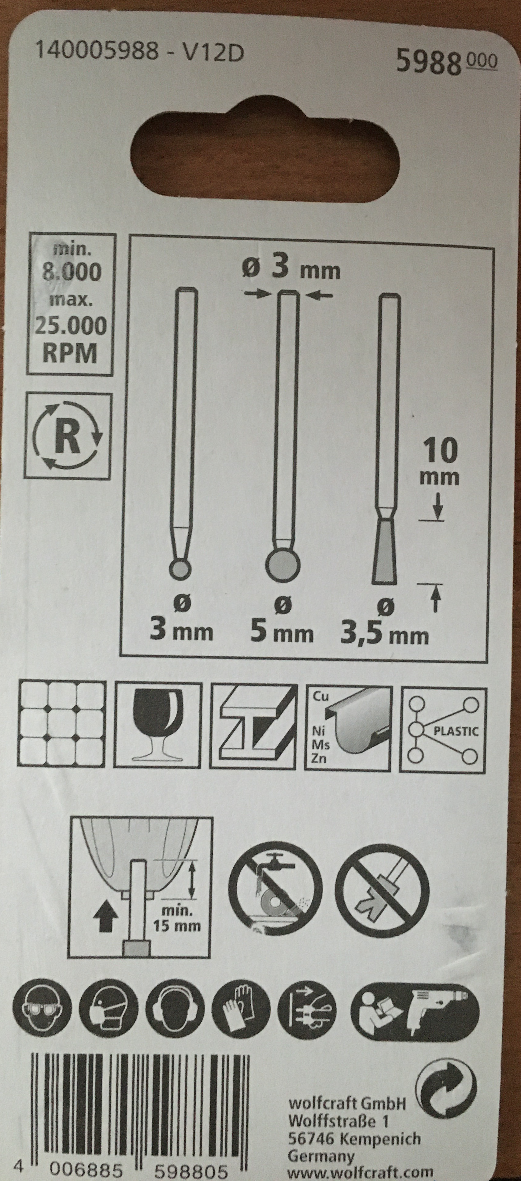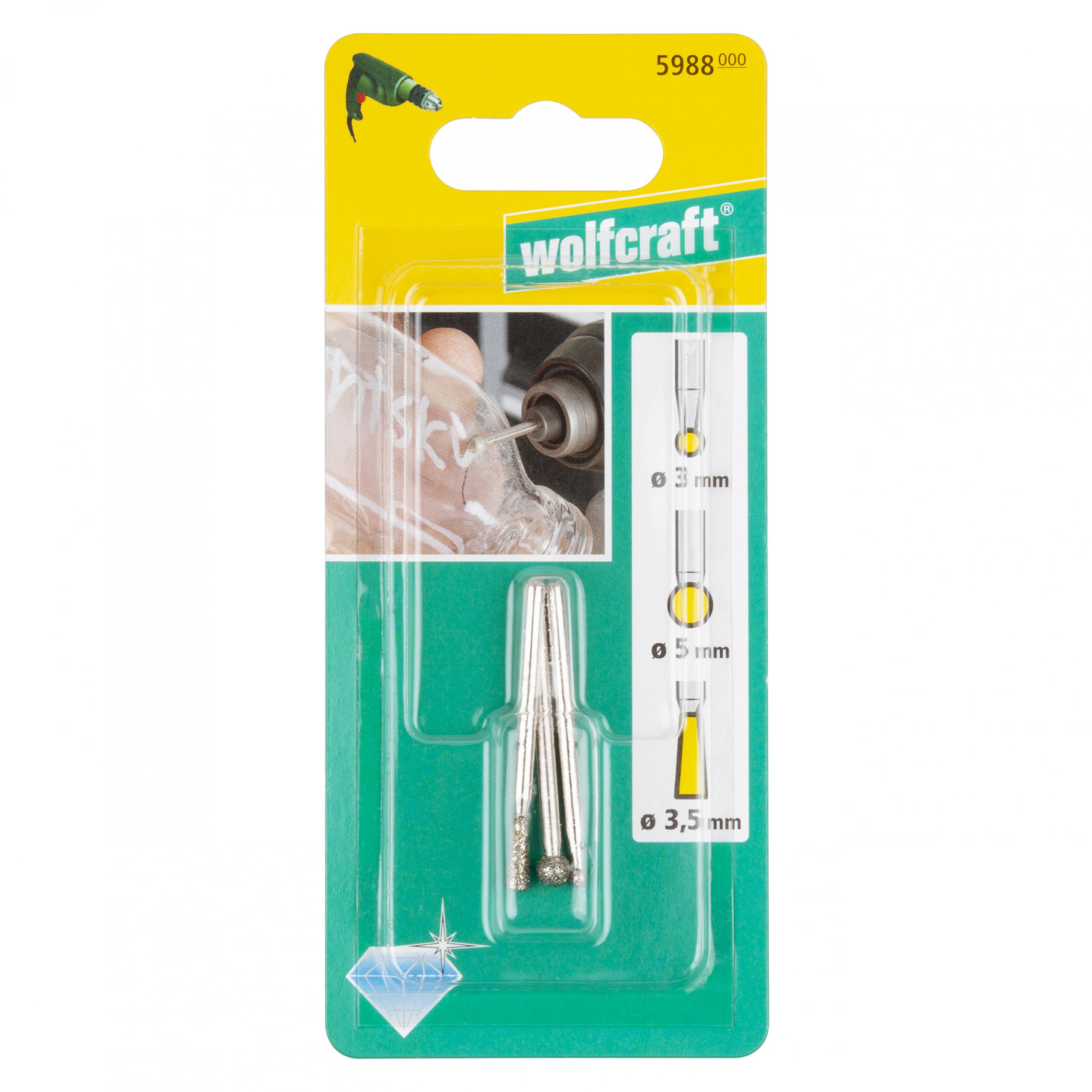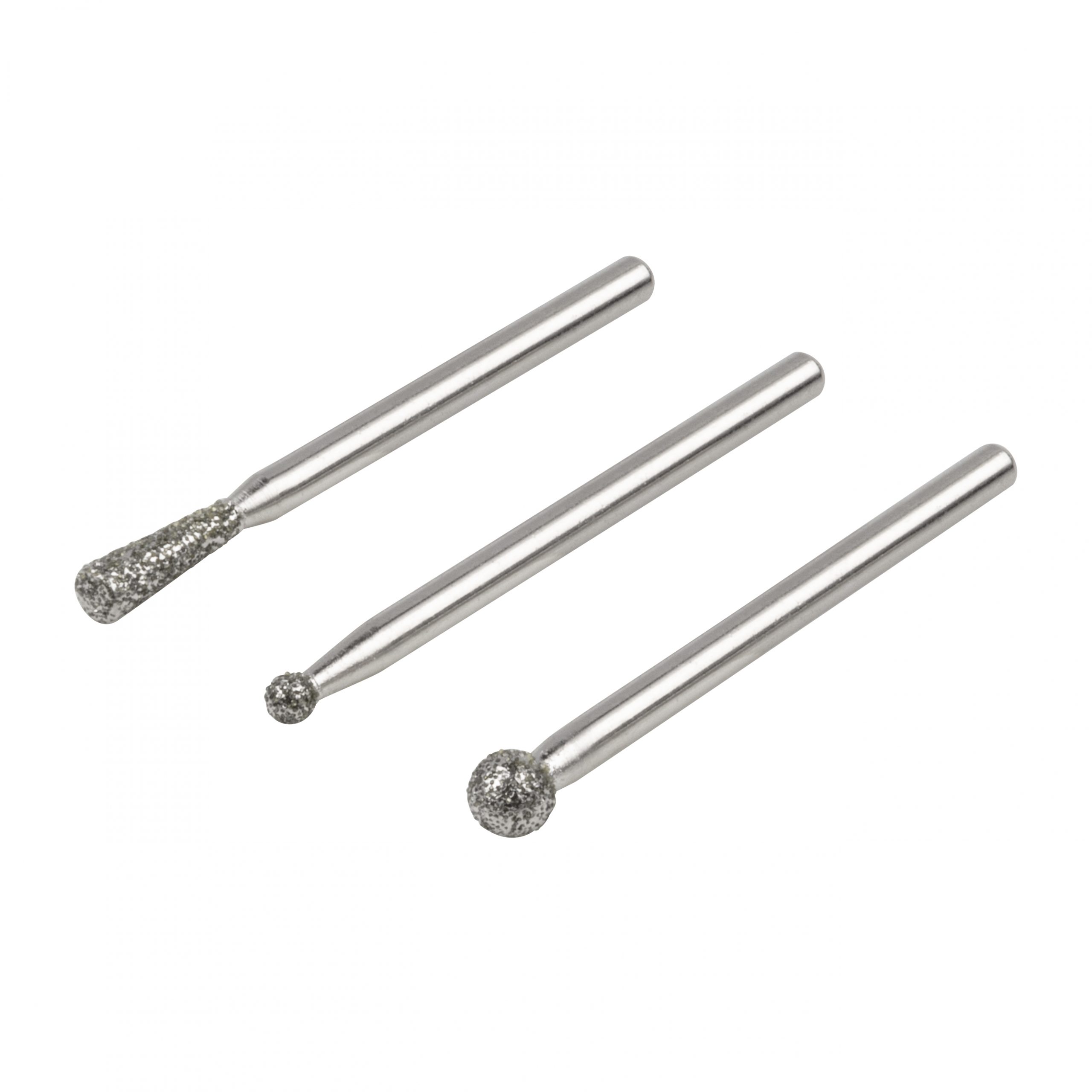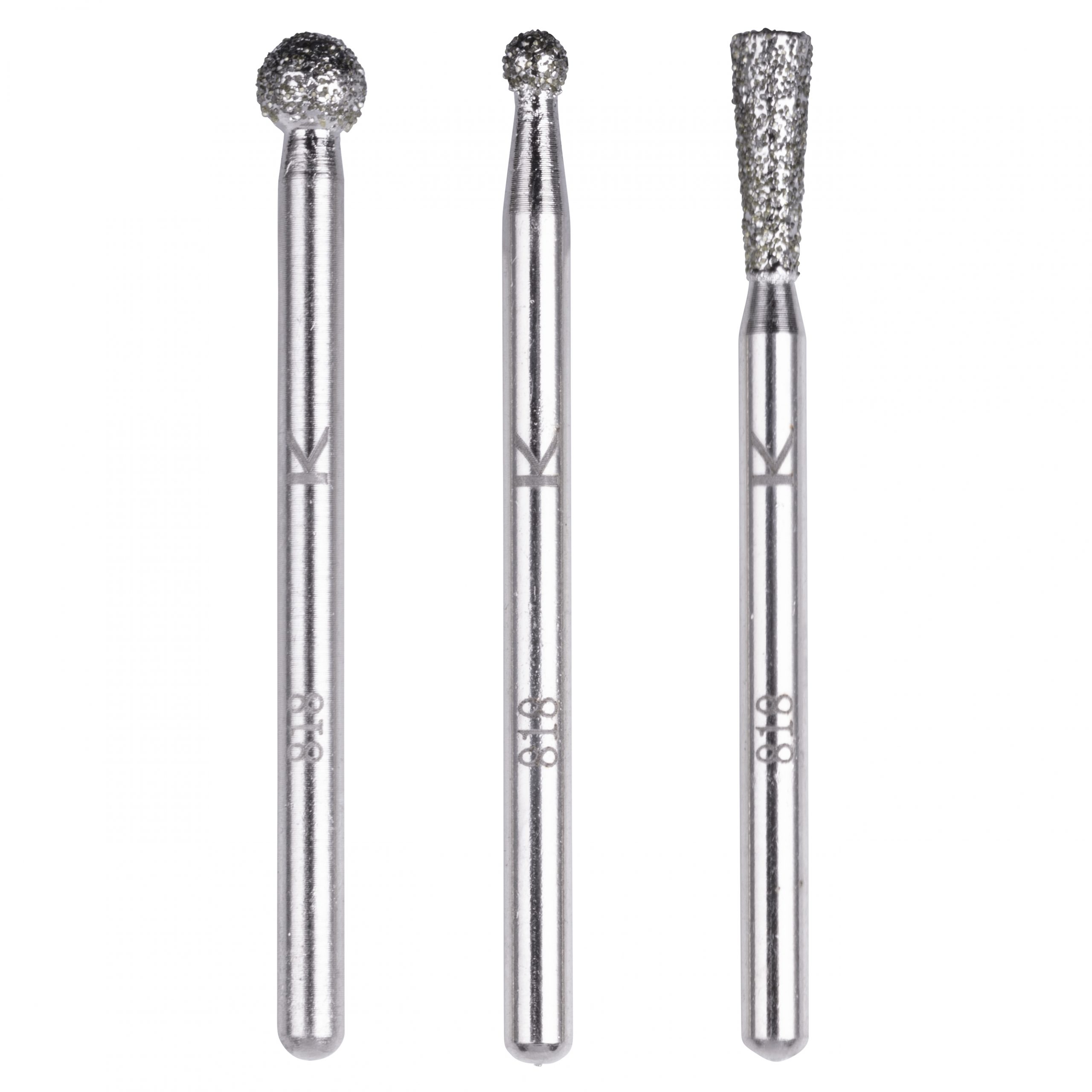 Mini brusky s diamantovou brusnou plochou. Určeno pro keramiku, sklo, železo, barevné kovy, plast. Vhodné pro detailní práci s keramickou dlažbou, gravírování, rozšiřování otvorů. Pracovní hloubka do 15 mm. Průměr hřídele 3 mm. Pracovní rozmezí otáček 8-15 000, jen pravý chod.