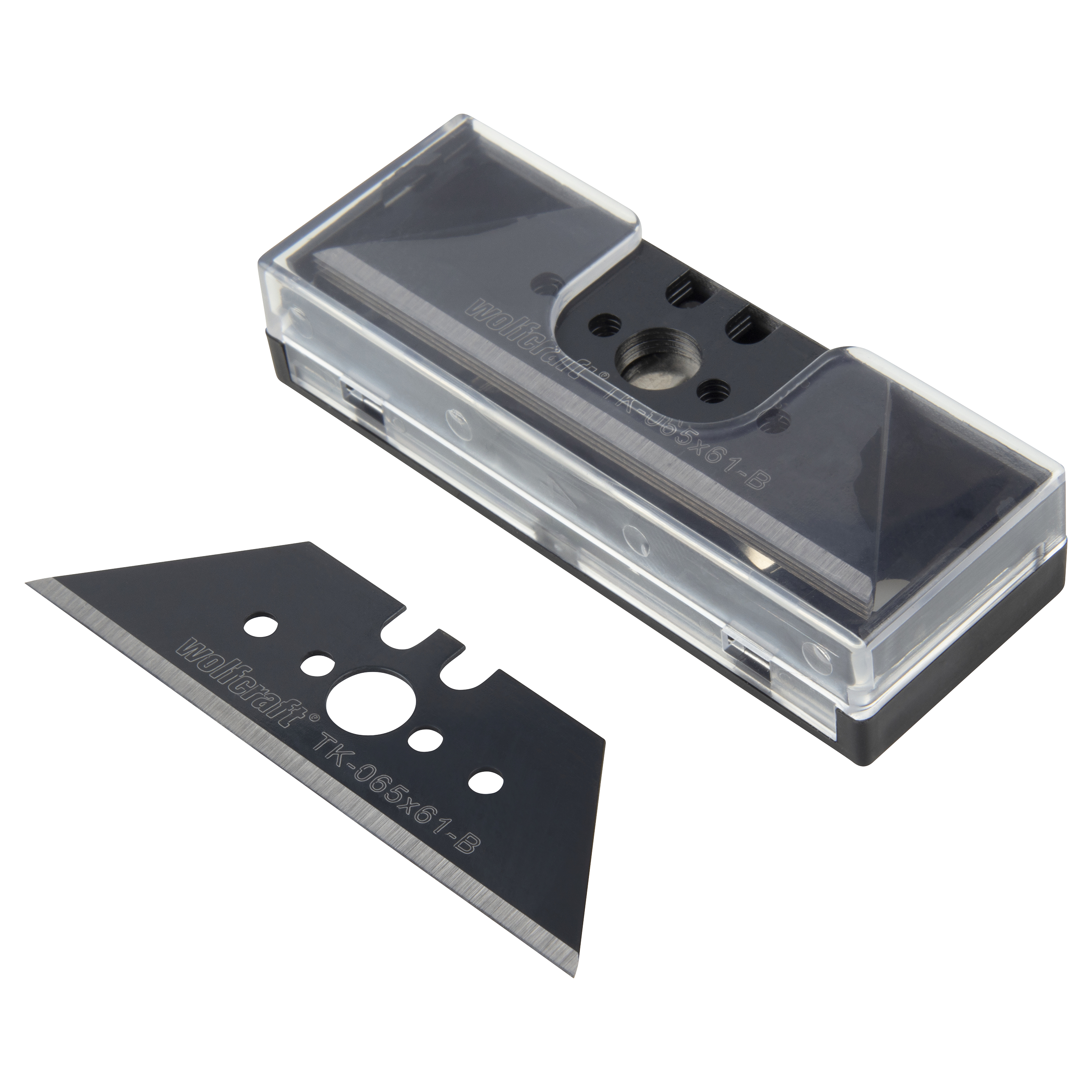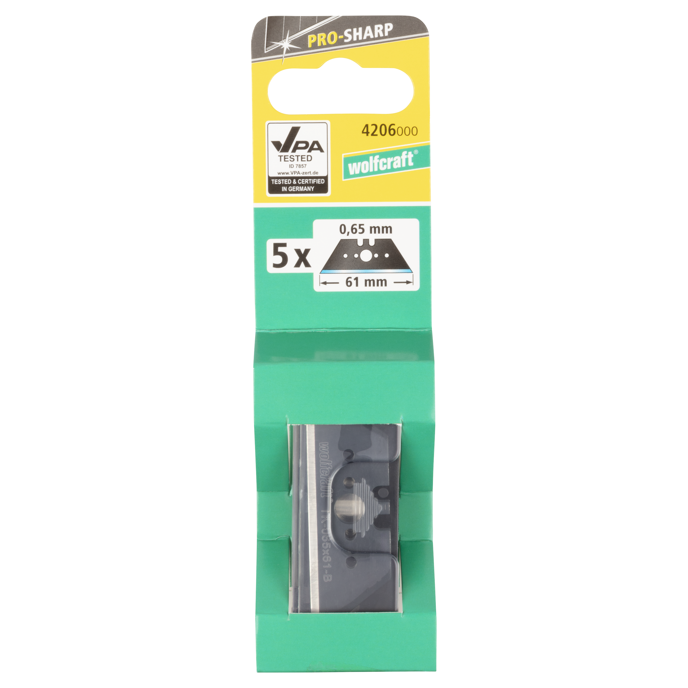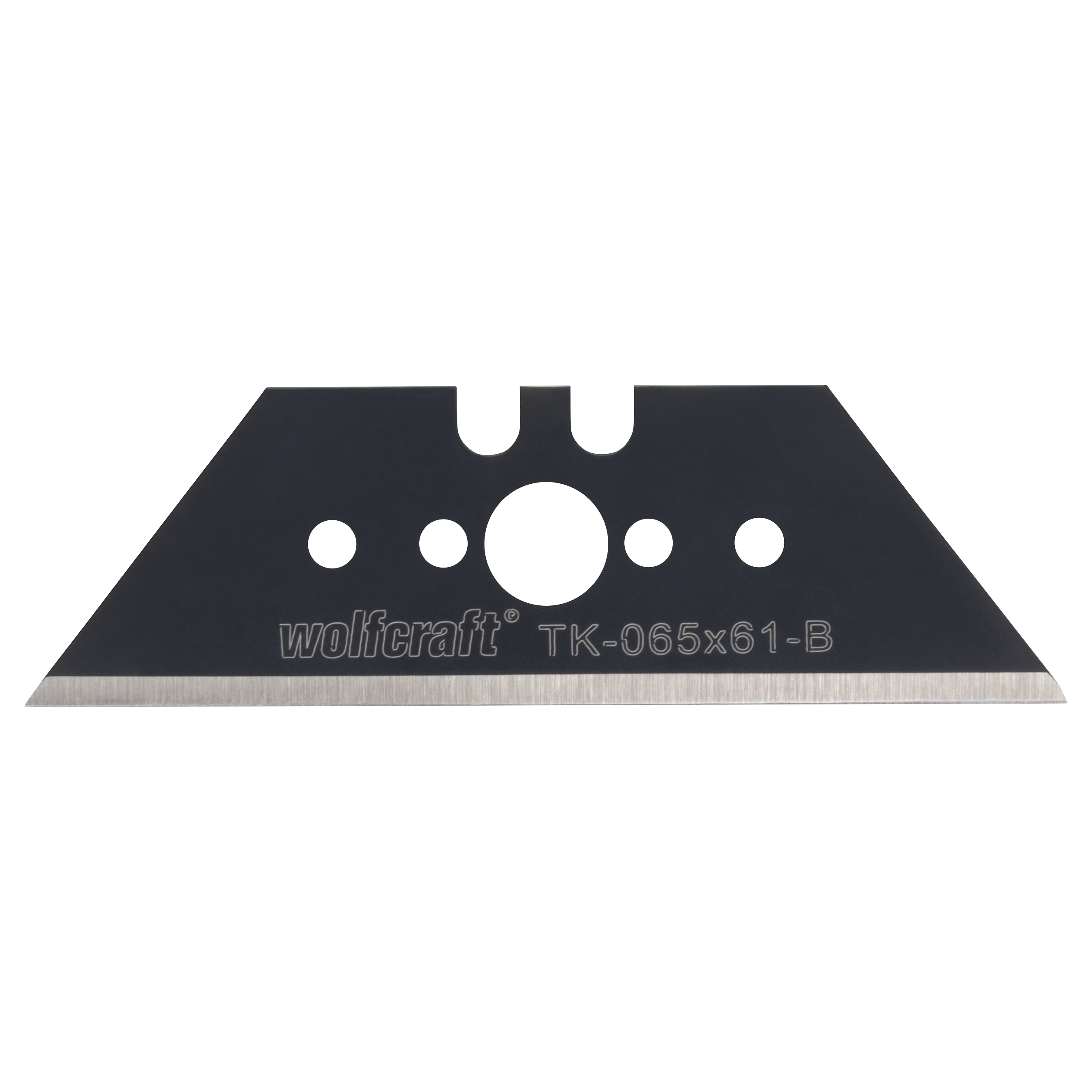 Pět černých mimořádně ostrých trapézových čepelí (61 mm × 0,65 mm) z vysoce kvalitní uhlíkové oceli nabízí díky speciálnímu broušení podle certifikátu VPA o 30 procent lepší řezný výkon než běžné čepele. Jsou kompatibilní s běžně dostupnými noži s trapézovou čepelí. Lze je bezpečně uchovávat v průhledné plastové krabičce.