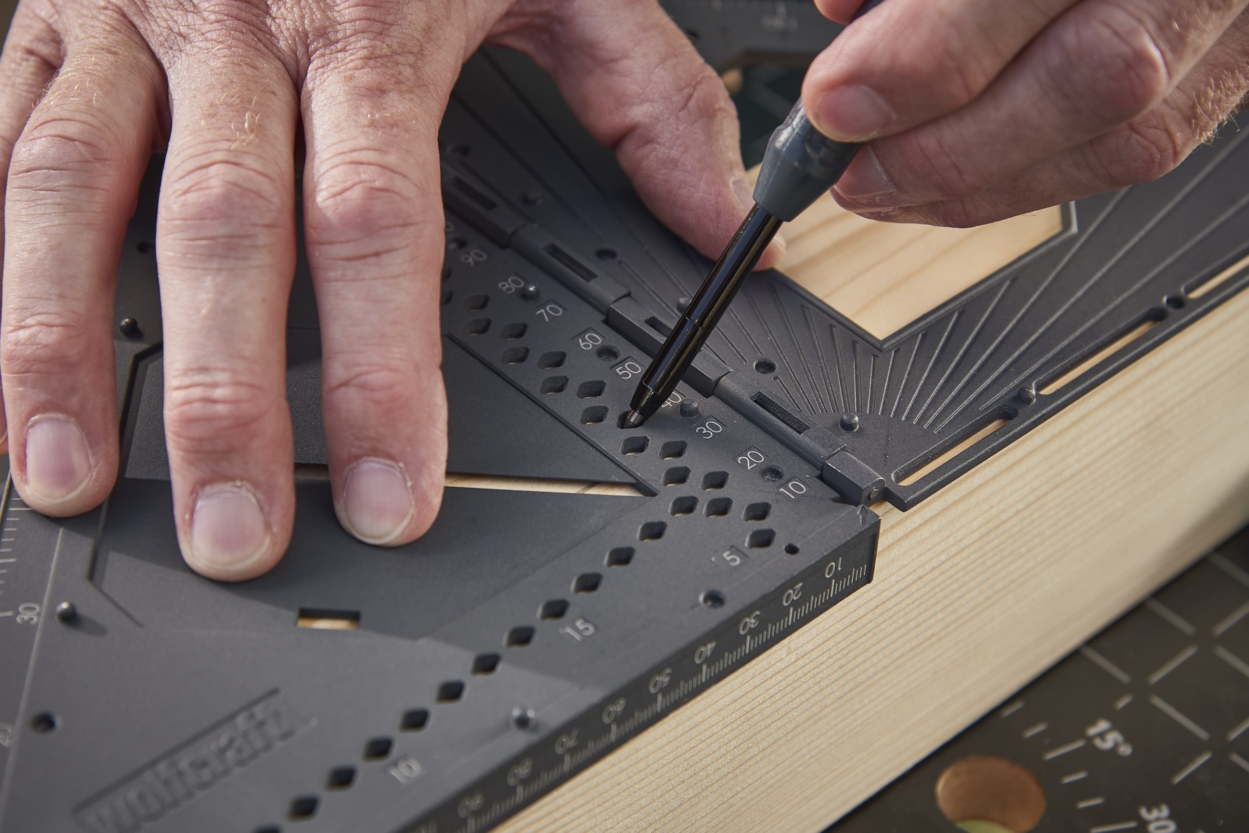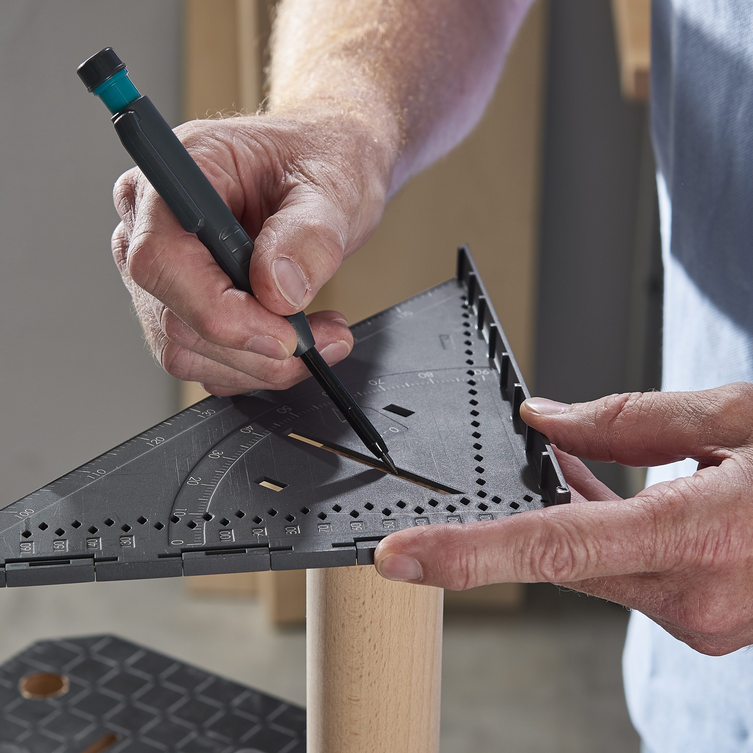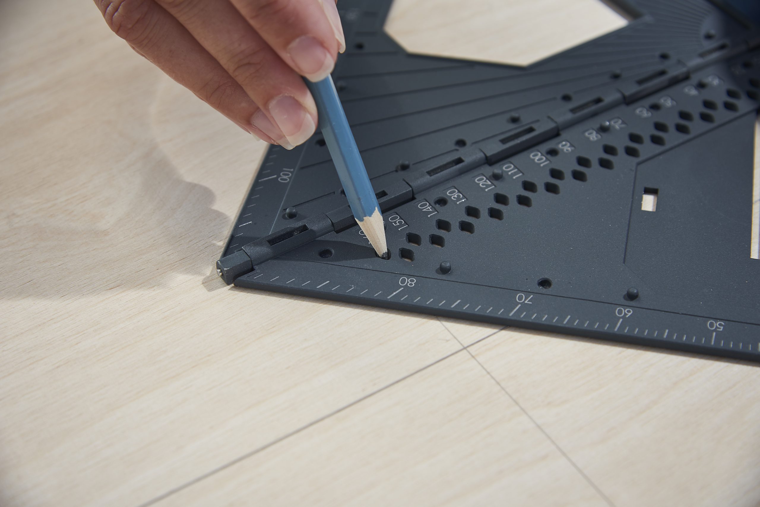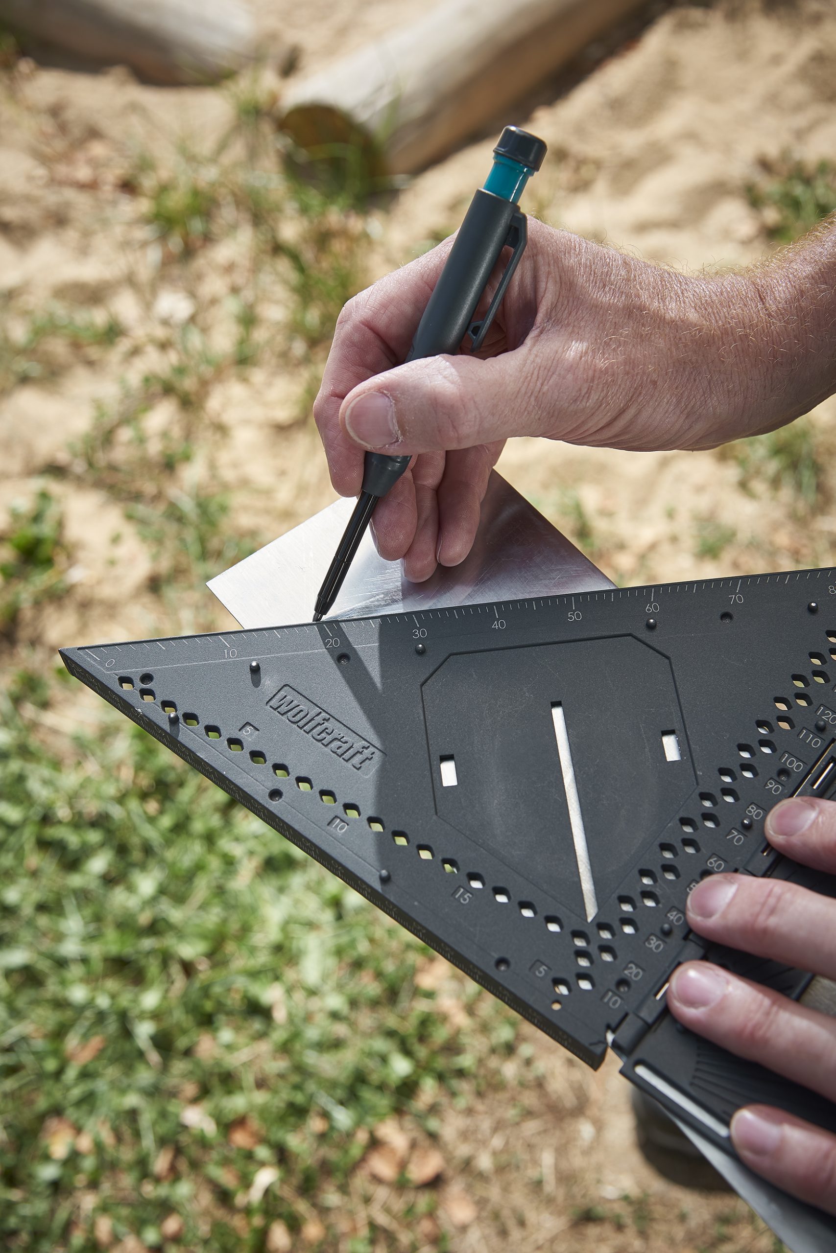 Milimetrová stupnice, zarážky pro úhly 45° a 90° a stupnice pro libovolný úhel od 0° do 180° umožňují přesné vyrovnání a přesné značení. Kromě toho lze úhelník pro měření a značení použít jako vytyčovací měrku pro vytyčování dokonalých rovnoběžných čar.