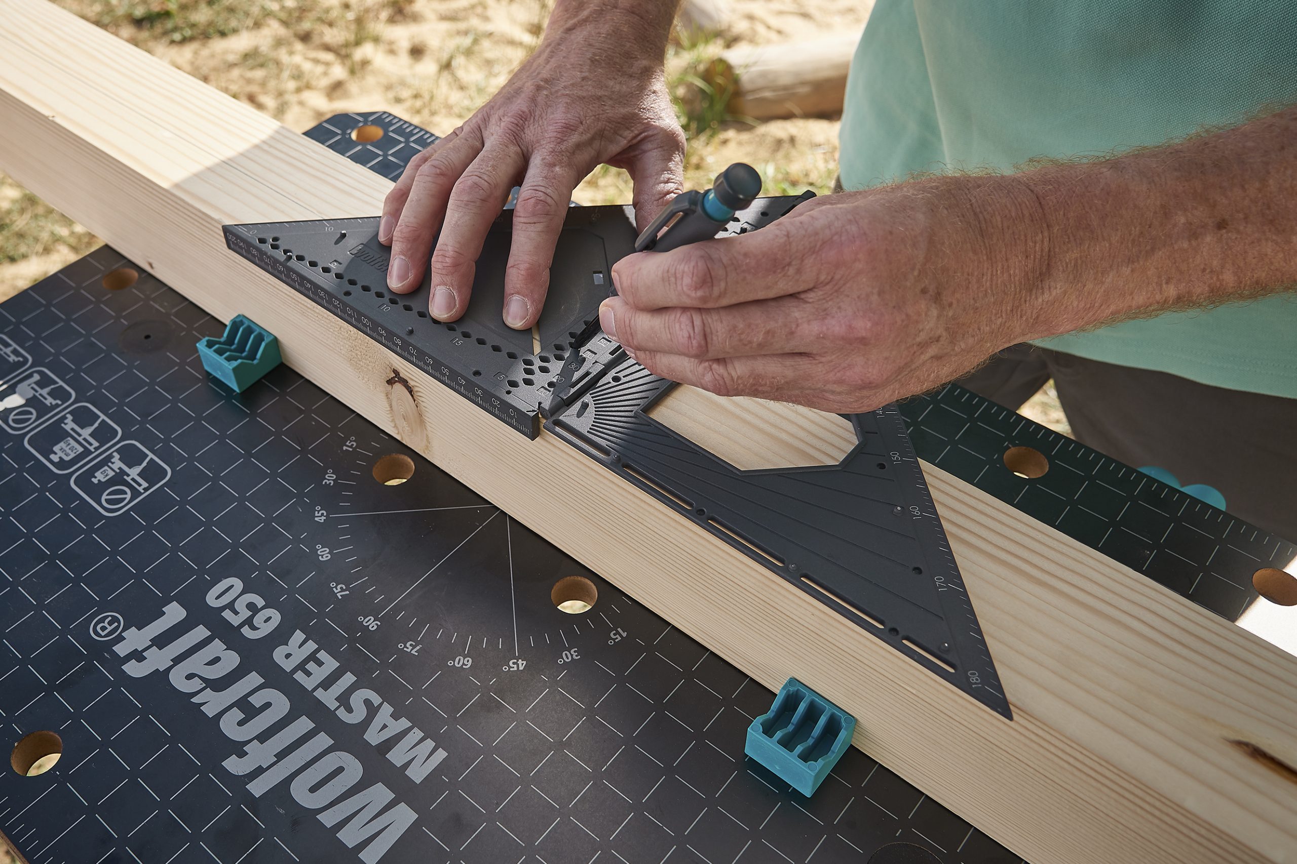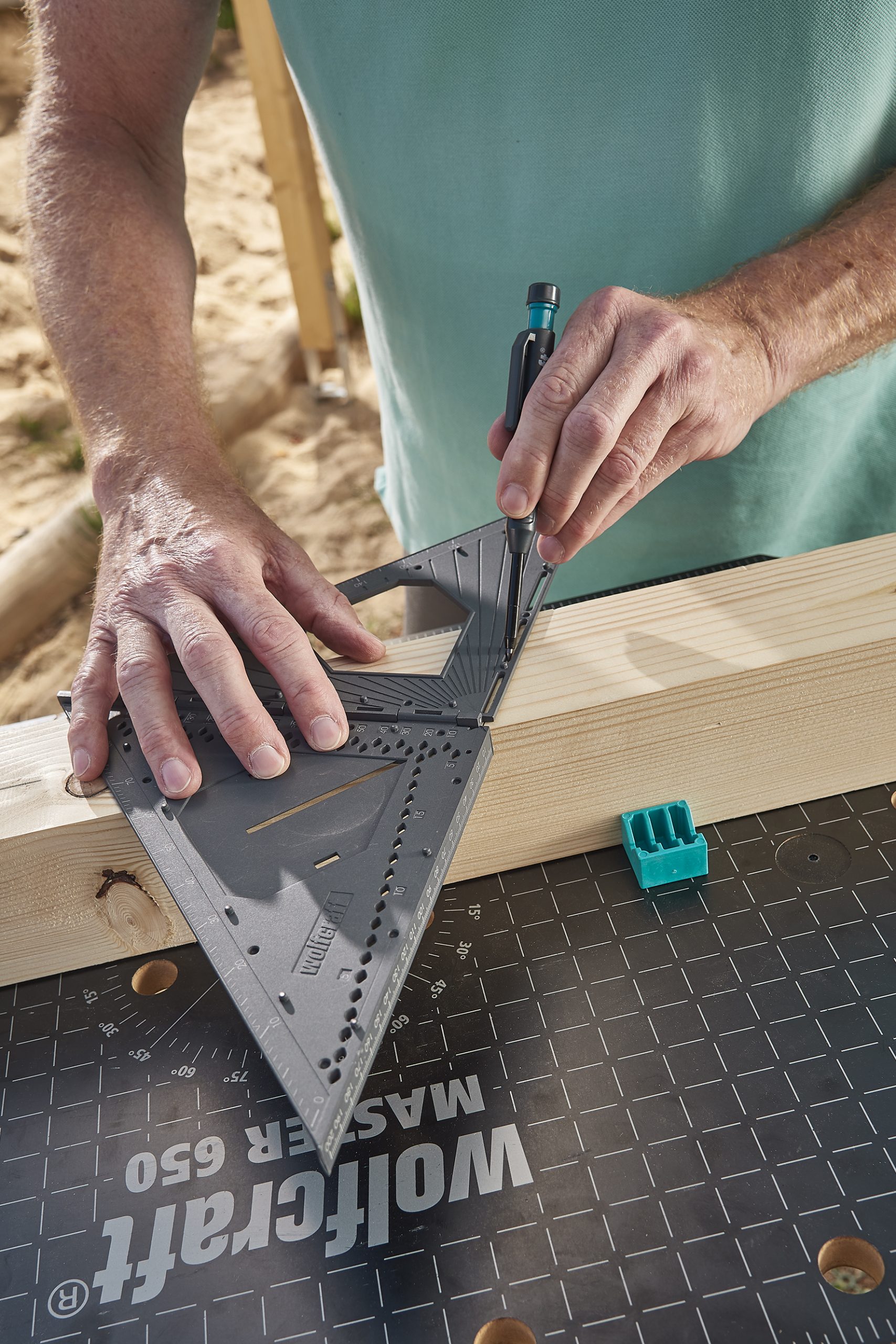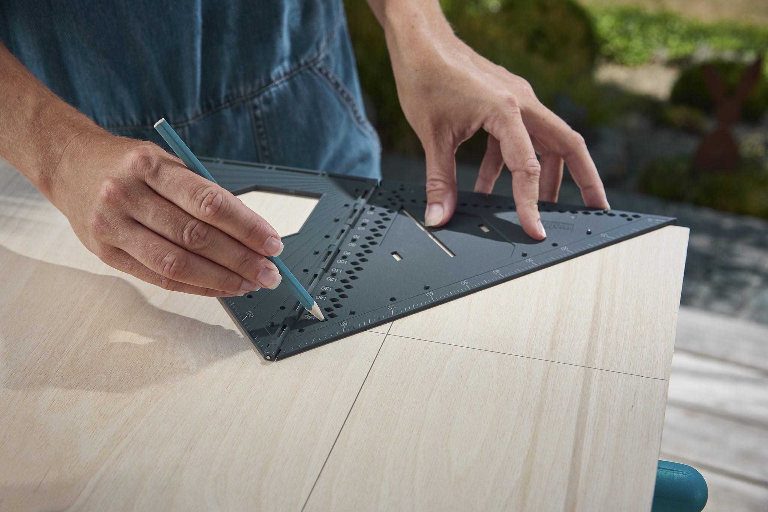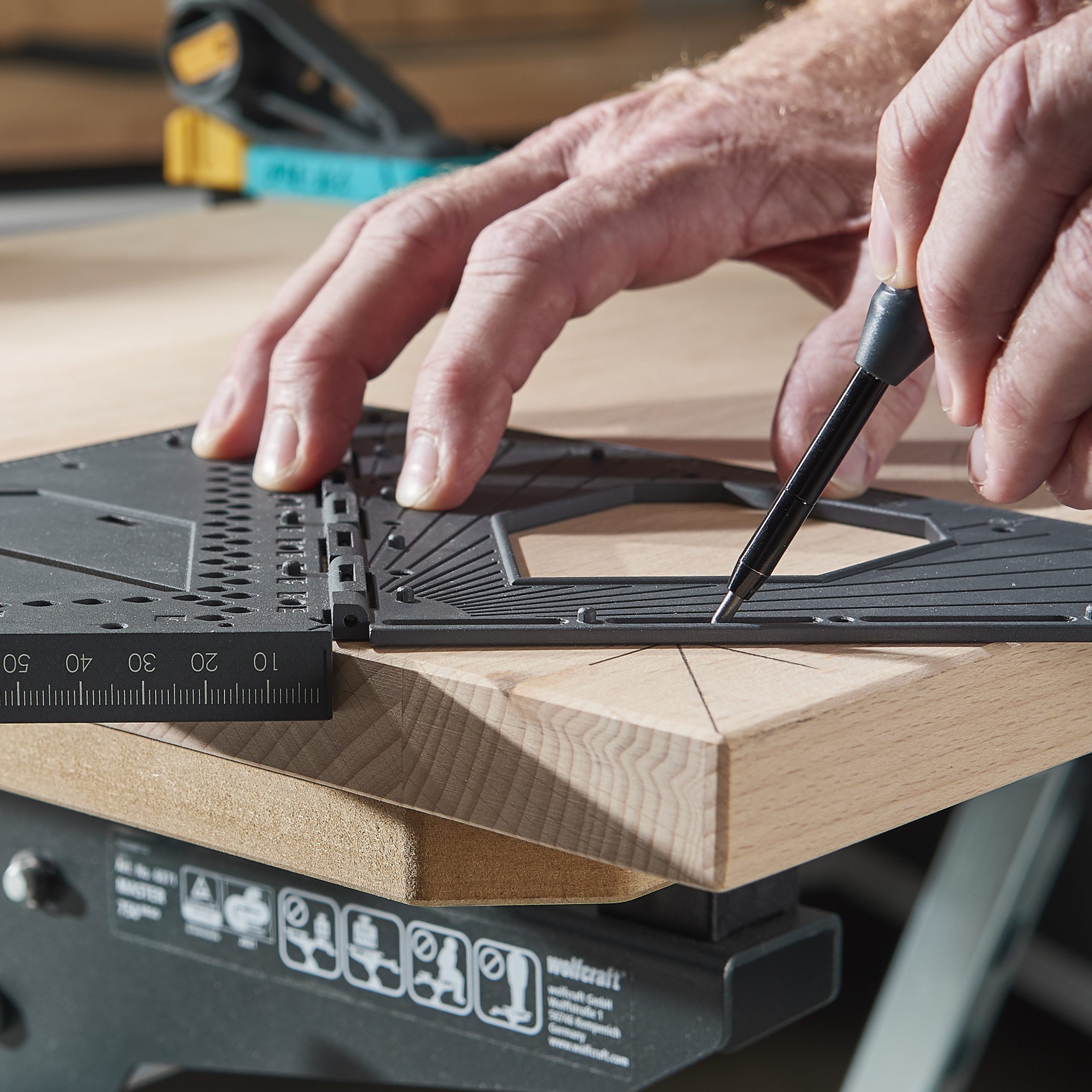 Milimetrová stupnice, zarážky pro úhly 45° a 90° a stupnice pro libovolný úhel od 0° do 180° umožňují přesné vyrovnání a přesné značení. Kromě toho lze úhelník pro měření a značení použít jako vytyčovací měrku pro vytyčování dokonalých rovnoběžných čar.