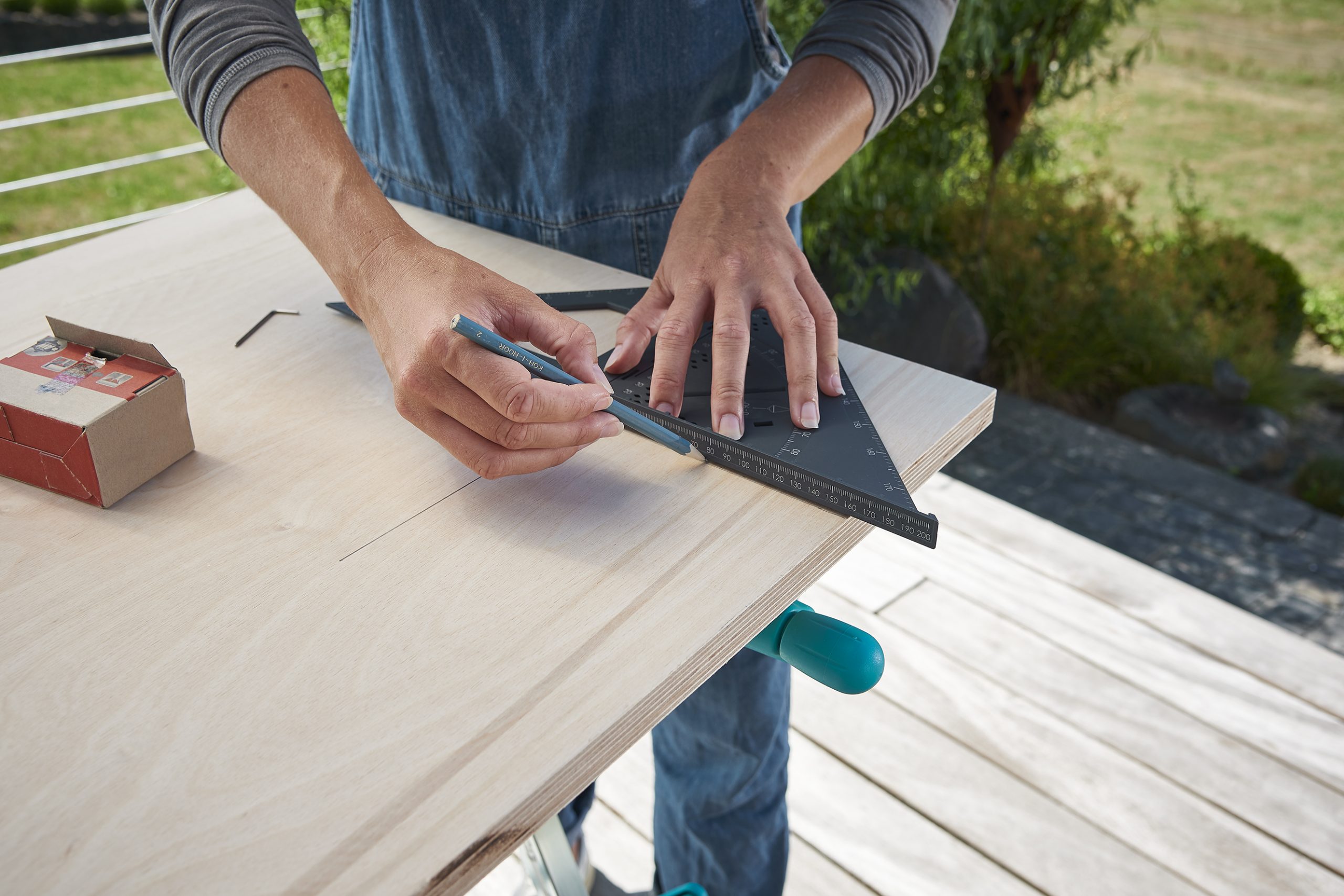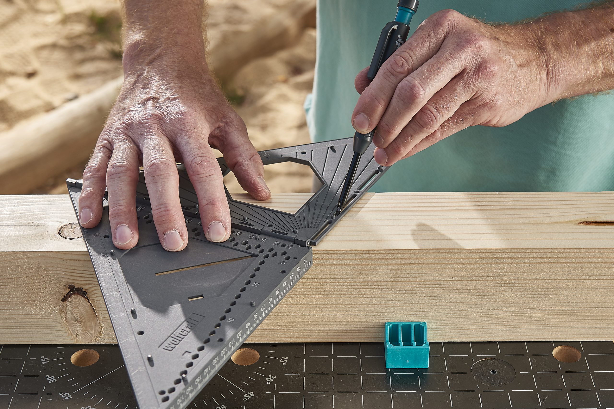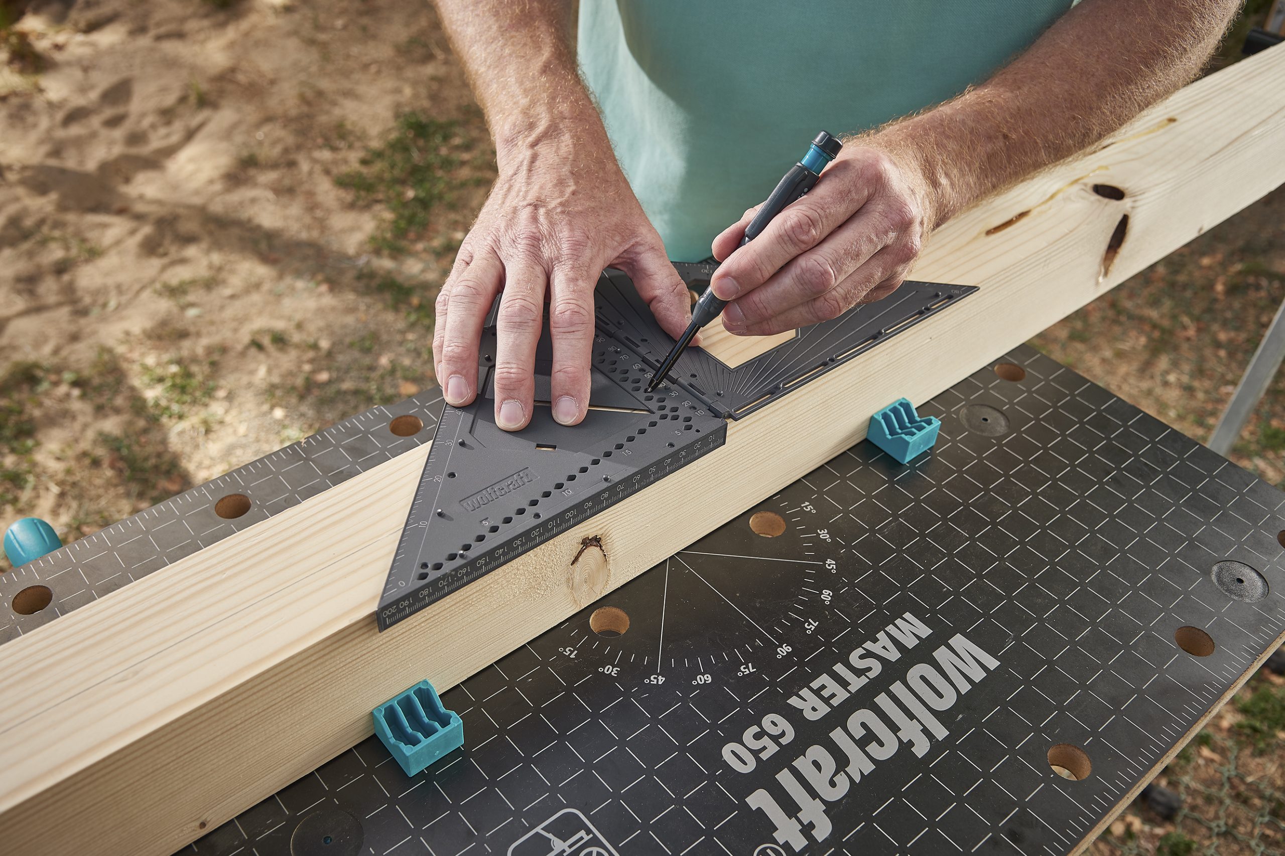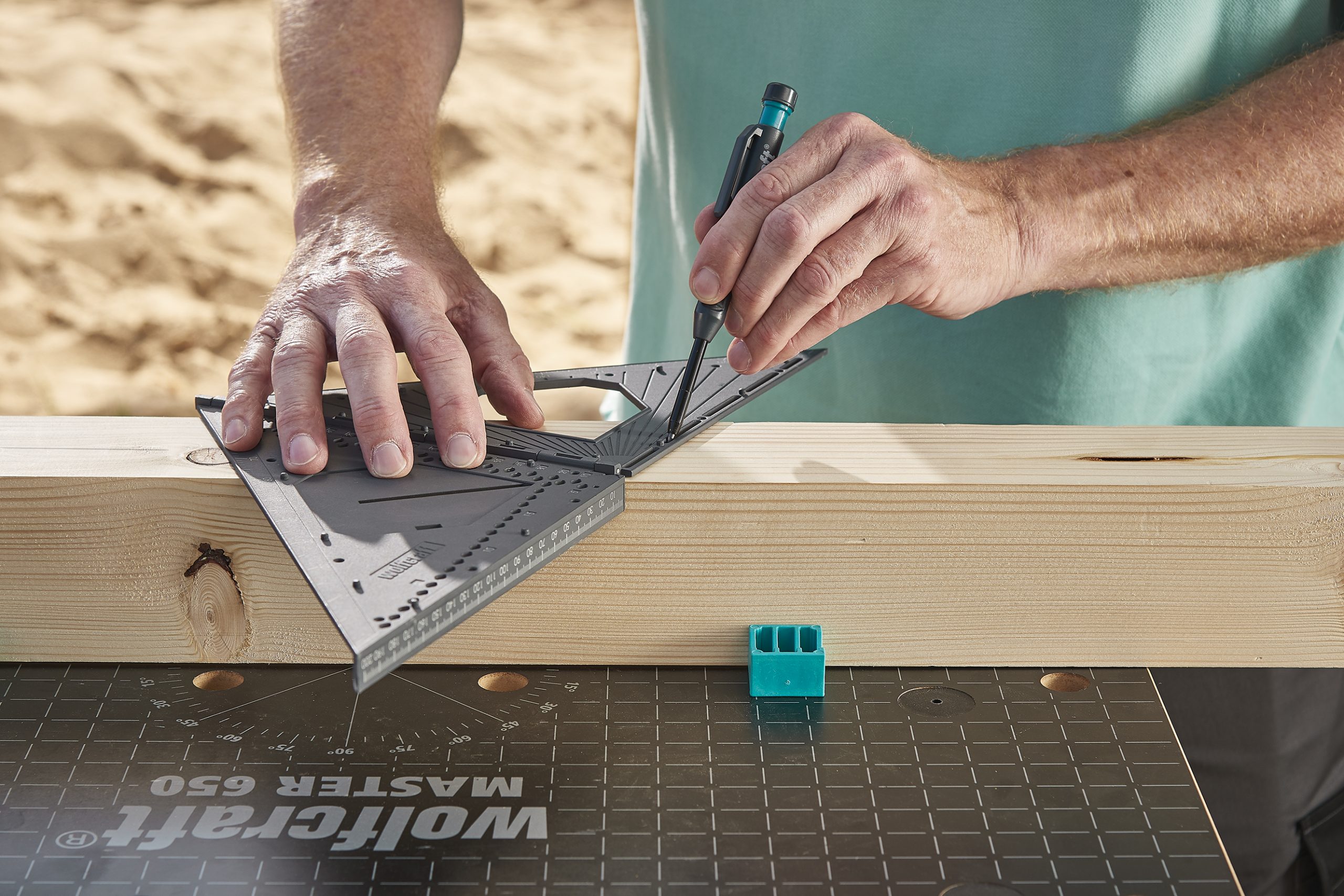 Milimetrová stupnice, zarážky pro úhly 45° a 90° a stupnice pro libovolný úhel od 0° do 180° umožňují přesné vyrovnání a přesné značení. Kromě toho lze úhelník pro měření a značení použít jako vytyčovací měrku pro vytyčování dokonalých rovnoběžných čar.