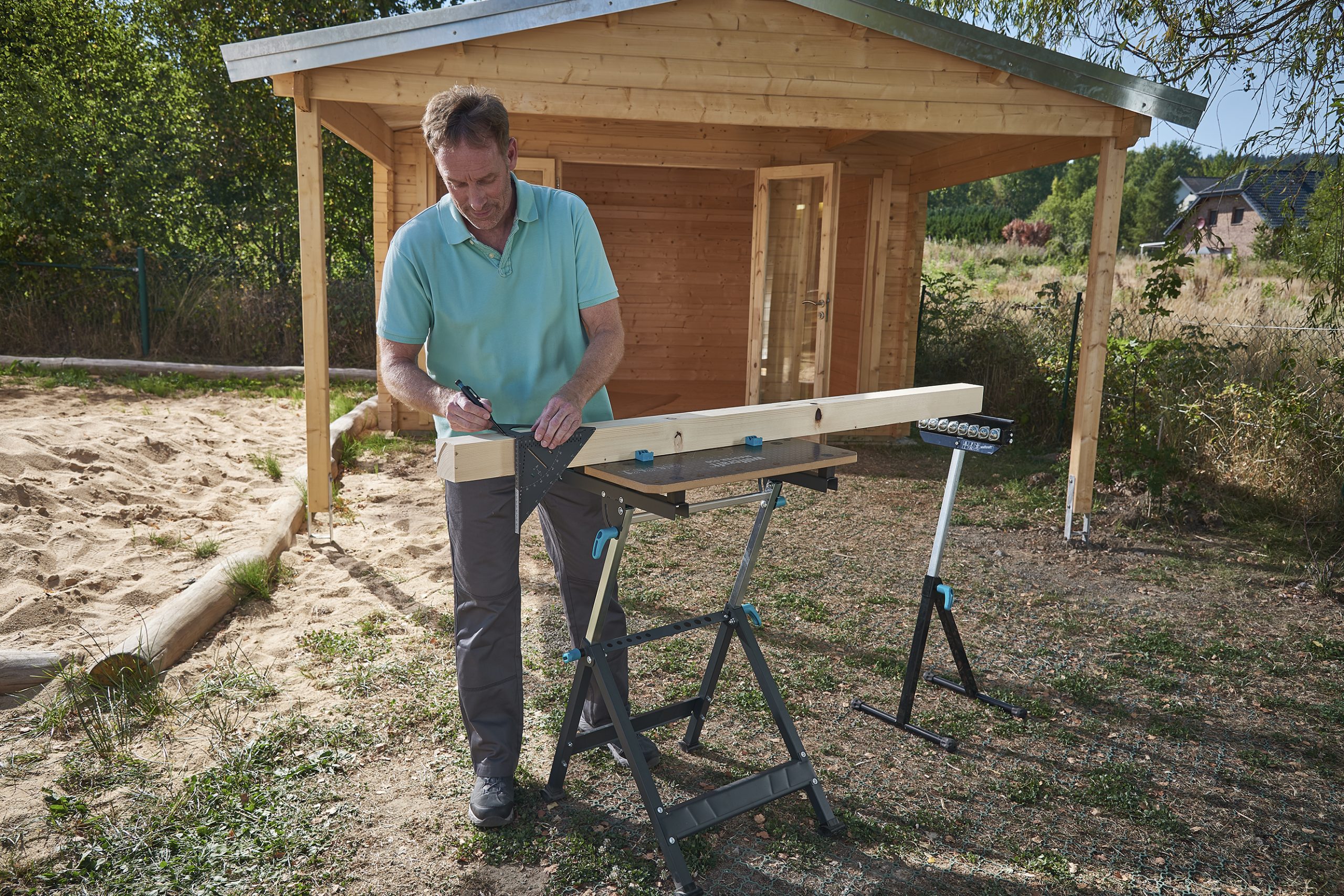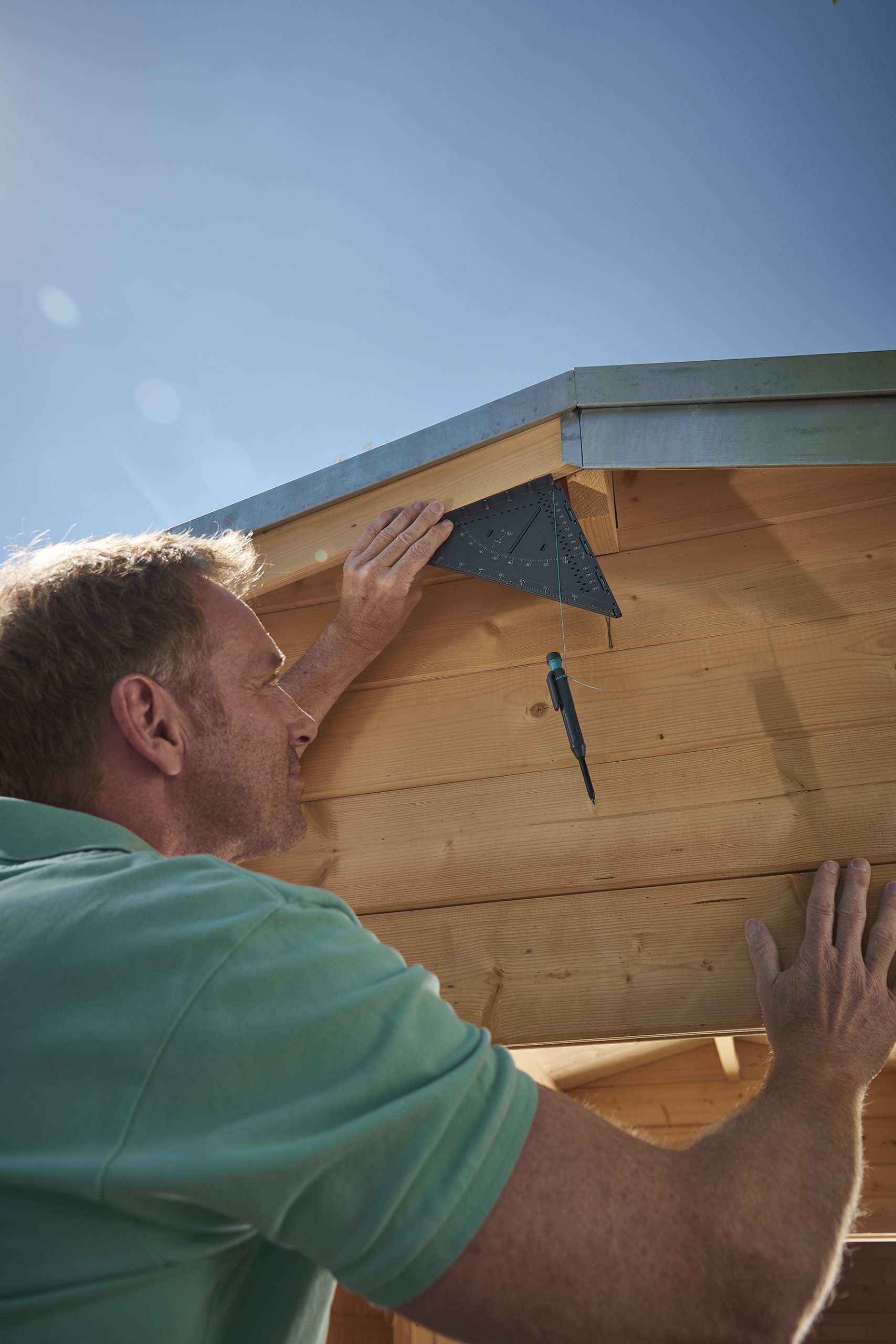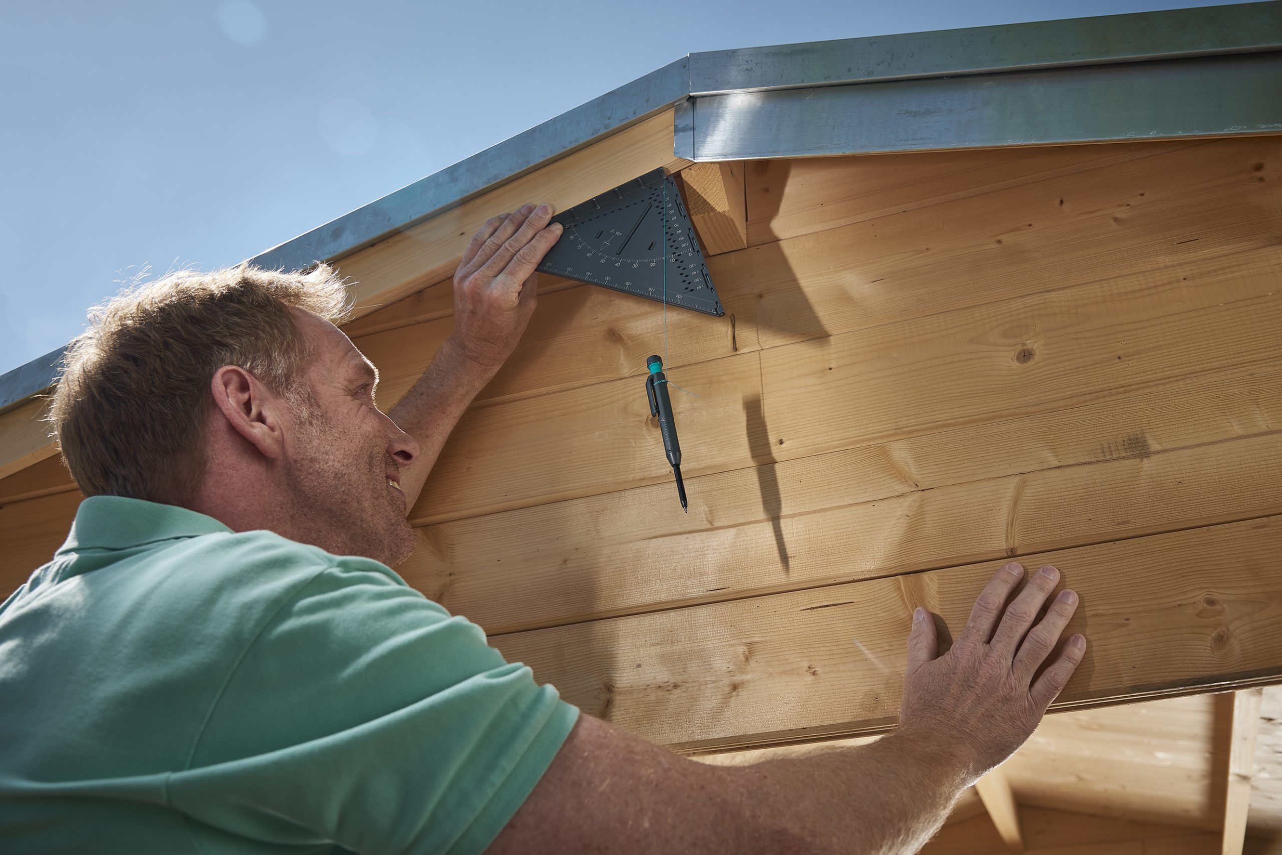 Měřicí a vytyčovací úhelník VARIO 3D Pro obstojí i v takových aplikacích, jako je určování úhlů sklonu, například u šikmých střech. Integrovaná olovnice vám pomůže odečíst stupně přímo na úhlové stupnici.