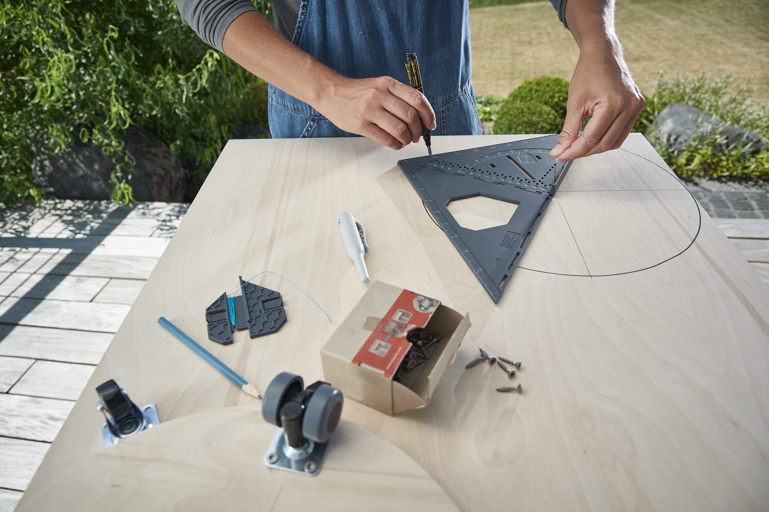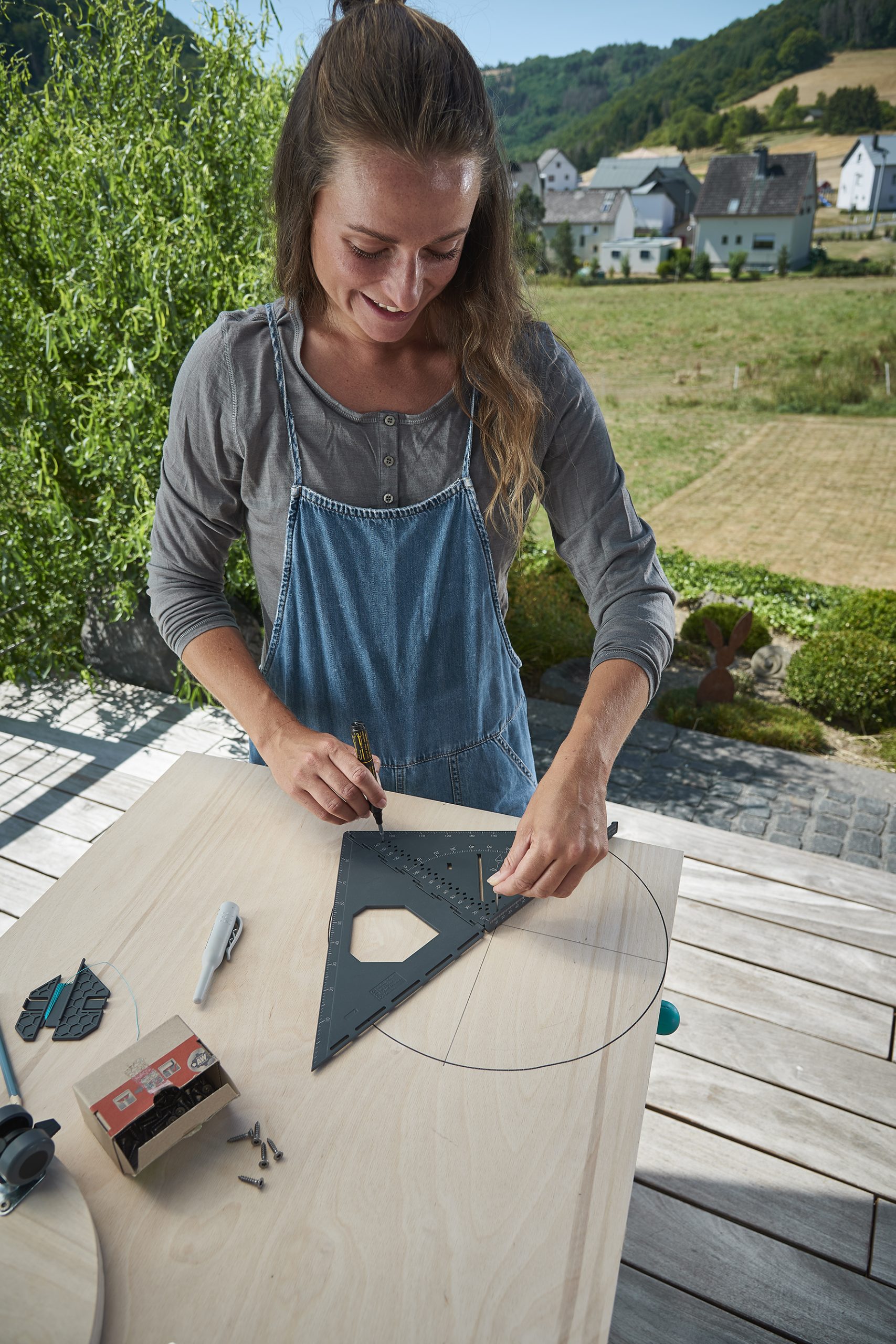 Integrovaný hledač středu vám pomůže určit přesný střed kulatých materiálů o průměru až 70 mm. S funkcí kompasu můžete během několika sekund nakreslit kružnice o poloměru až 160 mm.