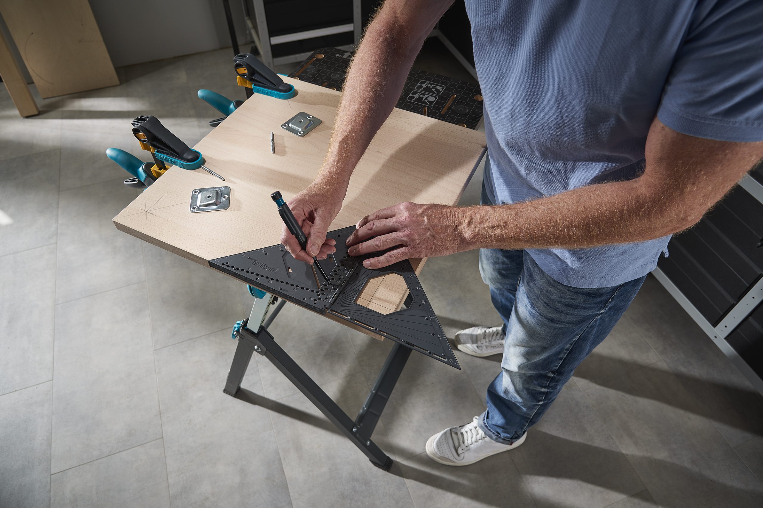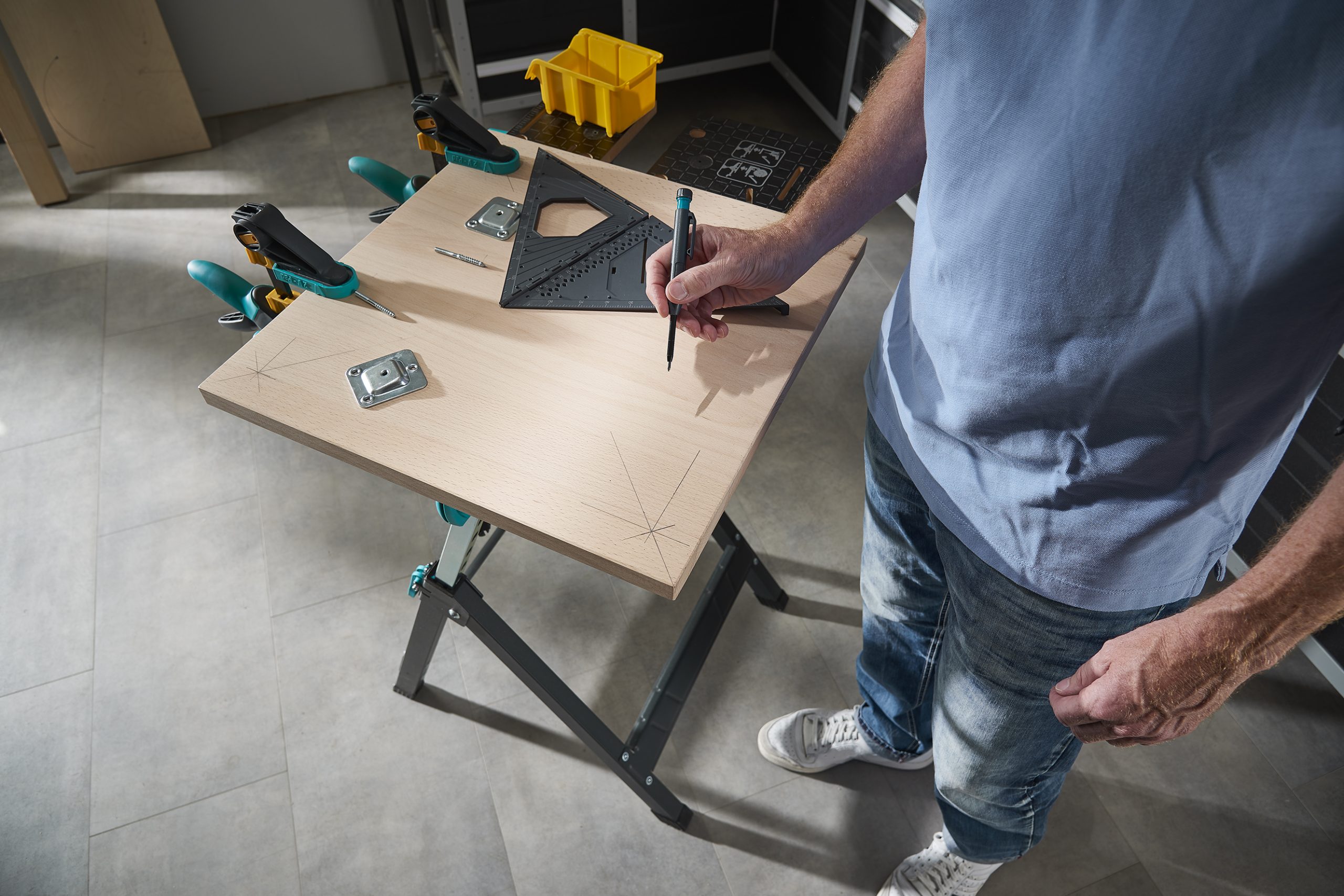 lze použít jako měřidlo a kompas, integrovaná olovnice a středník Měřicí a značkovací úhelník VARIO 3D Pro je multifunkční měřicí nástroj, který lze použít jak na rovných plochách, tak na trojrozměrných obrobcích. Díky skládacímu mechanismu jej lze používat pod různými úhly. Díky tomu lze snadno přenášet měření na nosníky, trubky apod. Ve složeném stavu funguje jako nastavovací čtverec.